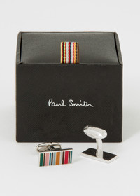 Men's rectangular cufflinks featuring a multistripe pattern, a polished silver finish and Paul Smith signature embossed T-bar fastenings. 70% Copper, 30% Zinc with 100% Enamel Size: 2 x 1cm Product Code: M1A-CUFF-APMINI-92