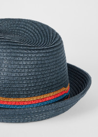 Crafted from woven straw, this navy 'Trilby' hat features an 'Artist Stripe' trim to add a distinctive touch. Made with the warmer months in mind this straw hat is a seasonal staple. 100% Paper Straw Product Code: M1A-930DT-P489-47