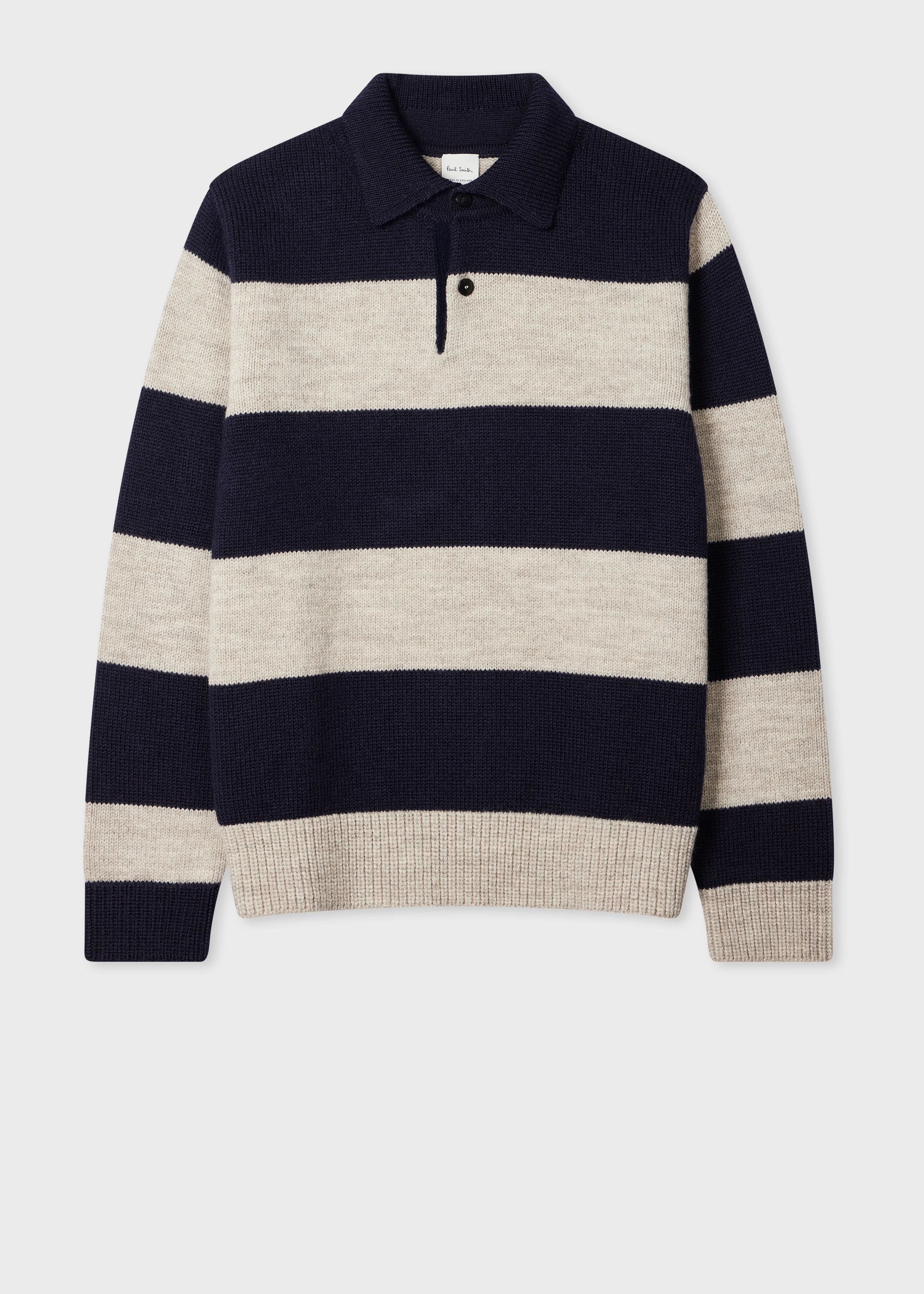 Made in England from premium 100% wool for warmth, this knitted polo sweater features a navy and ecru block stripe pattern. Complete with a polo style collar with two button placket, this sweater is finished with chunky ribbed cuffs and waistband for comfort. The Fit - Regular-Fit Product Code: M1R-756Z-R02917-49