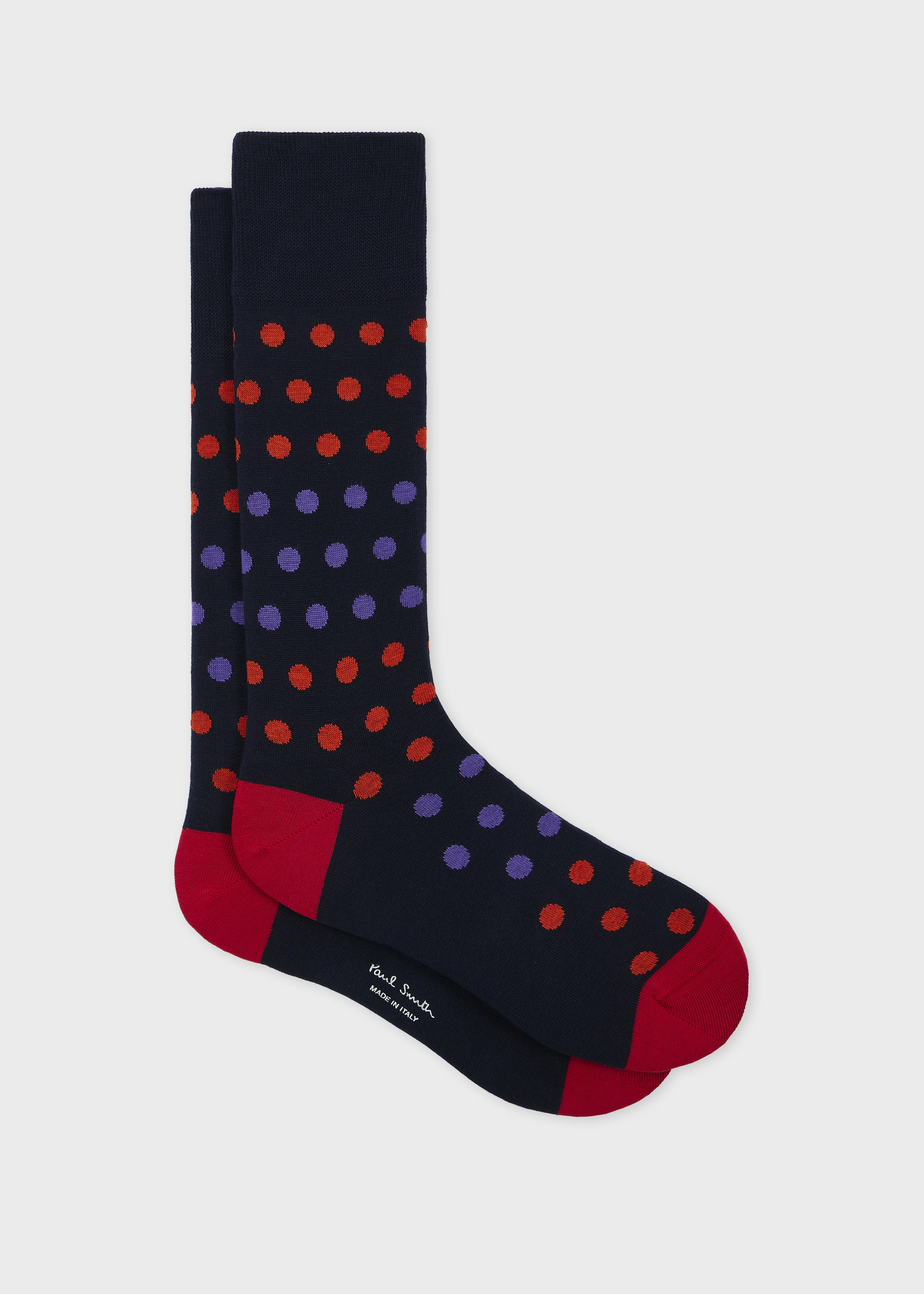 Made in Italy from a soft cotton-blend, these navy blue socks feature a multicolour polka dot pattern throughout. Ideal for everyday styling, these comfy socks add a pop of colour to your outfit. Made in Italy 87% Cotton, 12% Polyamide, 1% Elastane Machine Washable Product Code: M1A-380CI-T595-47