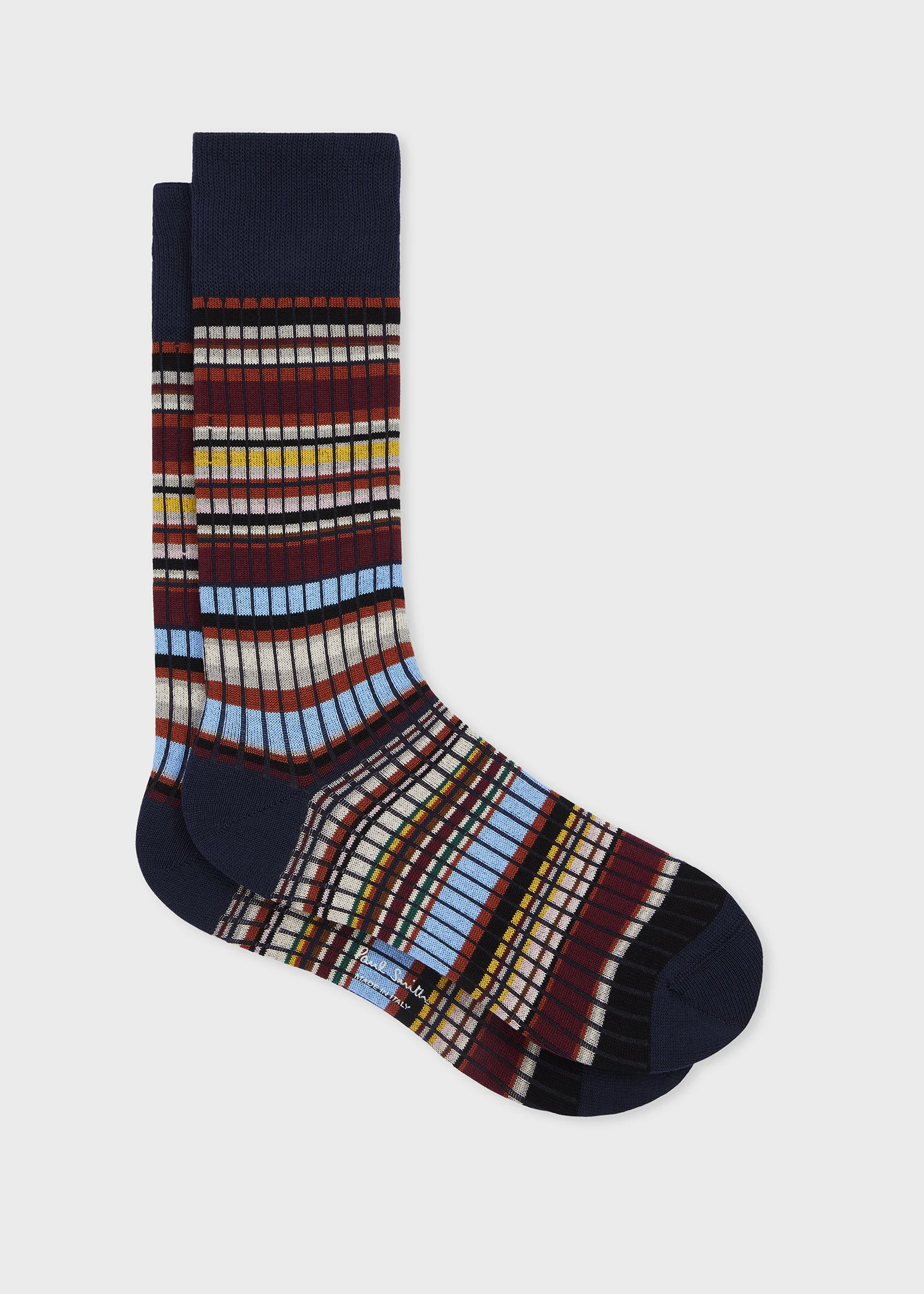 Made in Italy from a soft cotton-blend, these navy blue socks feature our classic 'Signature Stripe' and a ribbed construction. Perfect for adding a dash of colour and pattern to a formal outfit, these socks are finished with blue heels, toes and cuffs. Product Code: M1A-380CI-N109-47