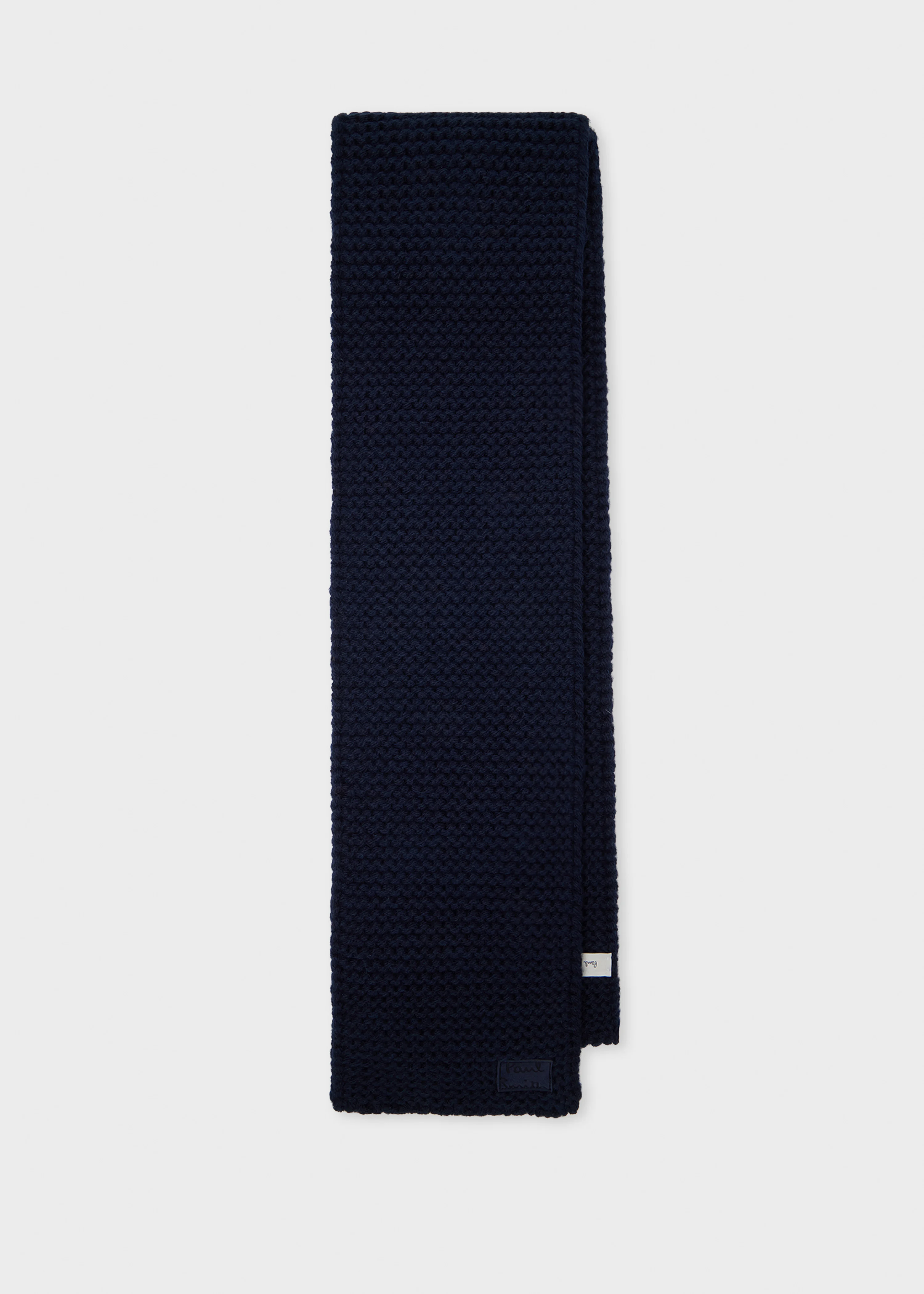 Crafted in Scotland from 100% wool, this navy scarf features a chunky knitted tactile finish. Complete with a tonal Paul Smith signature logo label, pair this scarf with the matching hat for added protection from the elements. Product Code: M1A-151MK-RT831-47