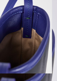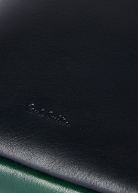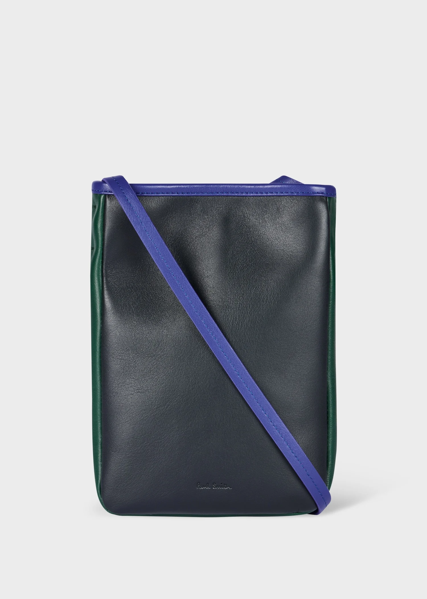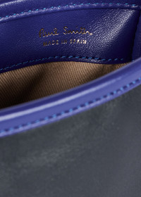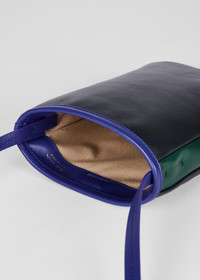 Made in Spain from premium soft leather, this small pouch bag features navy, green and cobalt panels. Finished with a mag-dot closure, beige twill lining and embossed Paul Smith signature logo detail. Height: 20cm x Width: 14cm Top of strap to bag: 59cm 100% Cow Leather Made in Spain Signature logo dust bag included Product Code: M1A-8143X-NPOUCH-47