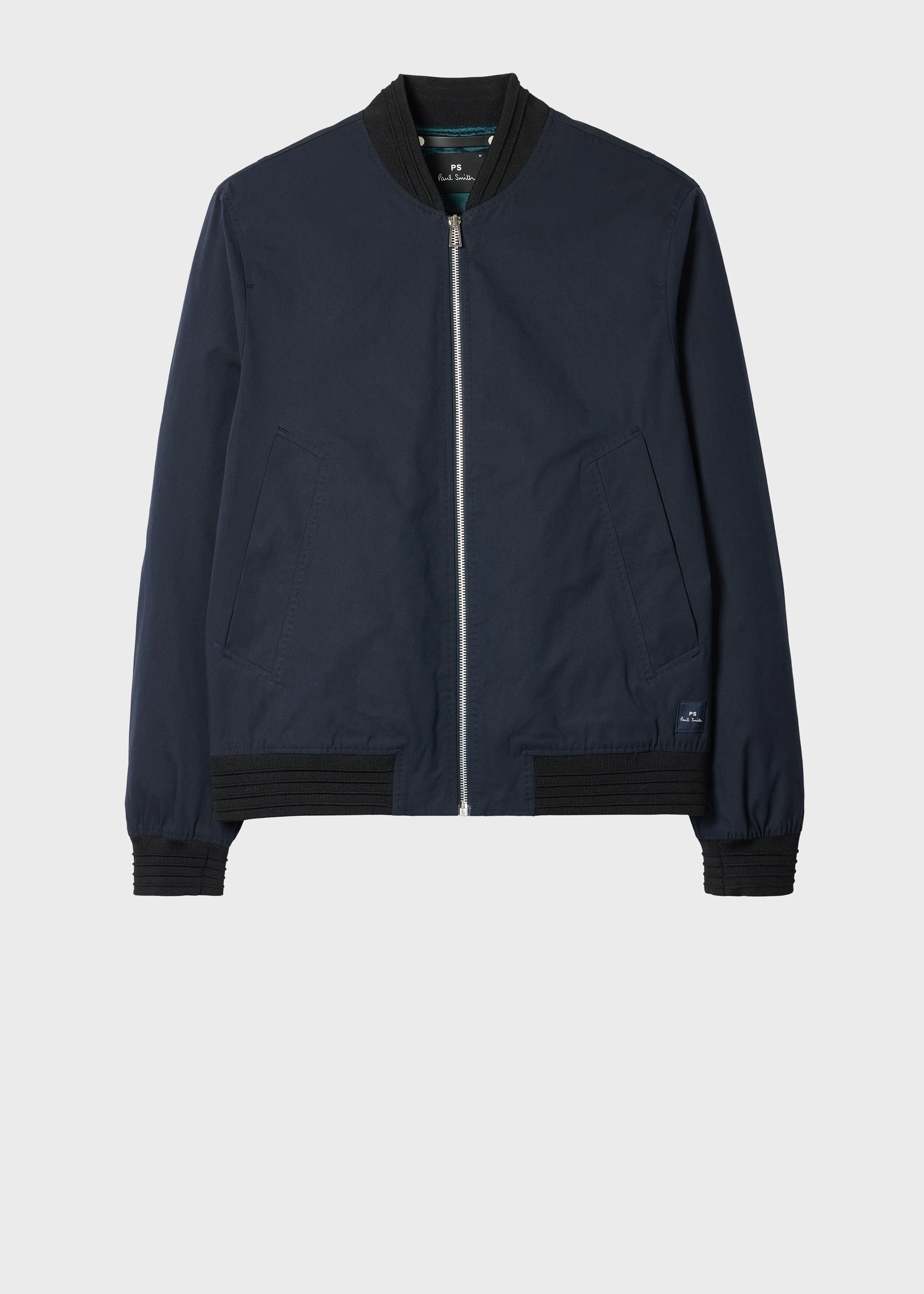 Made from a dry handle cotton-blend with stretch for added comfort, this navy bomber jacket features a timeless silhouette. Complete with raised stripe rib-knit trims for a tactile finish, this bomber is fully lined for comfort. The Fit - Regular-Fit Product Code: M2R-148Z-T22479-49