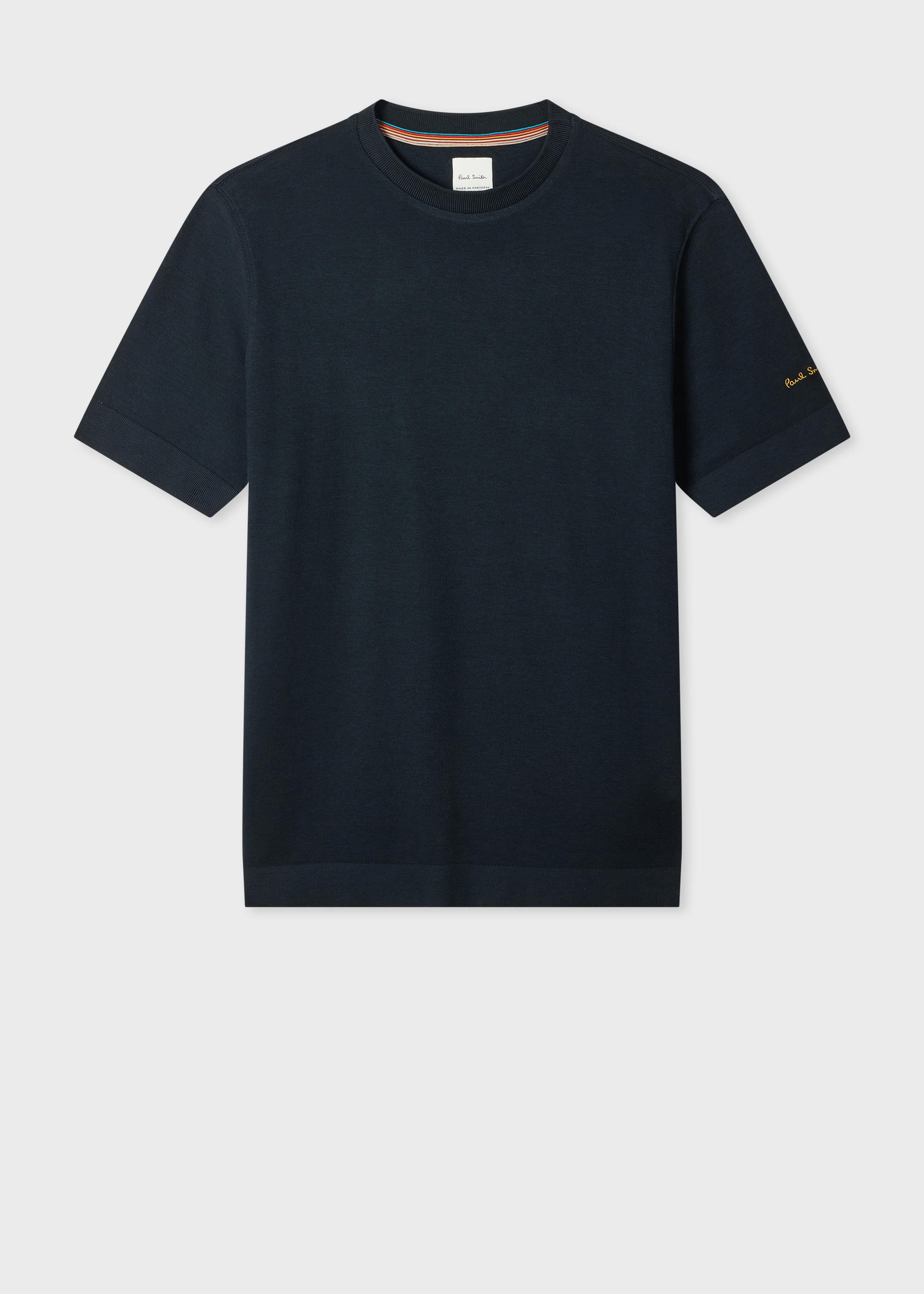 Made in Portugal from 100% organically grown cotton, this navy crew neck T-shirt features a soft and naturally stretchy finish and integrated ribbed trims at the cuff and waist. Finished with the Paul Smith signature logo on the sleeve and 'Signature Stripe' binding inside the collar - for a pop of colour. The Fit - Regular-Fit Product Code: M1R-747Y-V02936-49