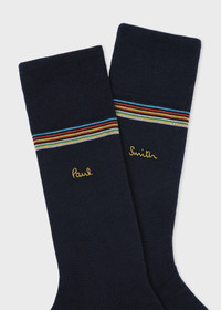 Made from a soft cotton-blend, these navy socks feature a gold embroidered Paul Smith logo and distinctive stripe trim. Adding a touch of luxury to everyday essentials, these socks combine comfort with signature style. Product Code: M1A-380CI-T639-47