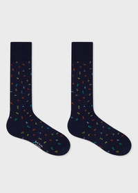 Made in Italy from a soft cotton blend, these navy socks feature a 'Letters' pattern throughout. Finished with tonal heel, toe, and cuffs. 77% Cotton, 21% Polyamide, 2% Elastane Machine washable Made in Italy Product Code: M1A-380CI-N048-47