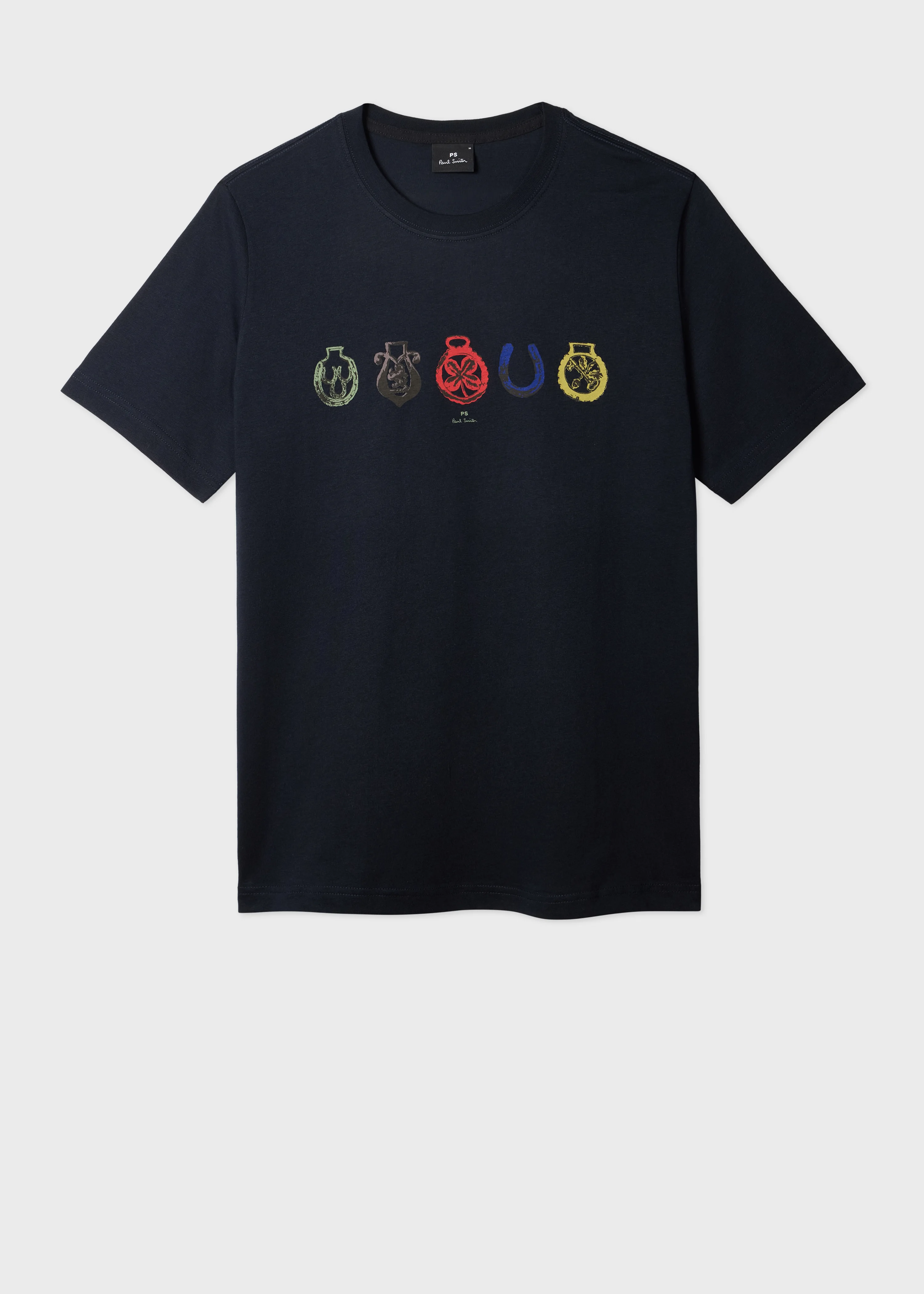 Made from organically grown cotton for a soft finish, this navy crew neck T-shirt features a seasonal 'Lucky Charm' print. Cut for a regular-fit, this T-shirt is finished with a ribbed collar. The Fit - Regular-Fit Product Code: M2R-011R-VP5716-49