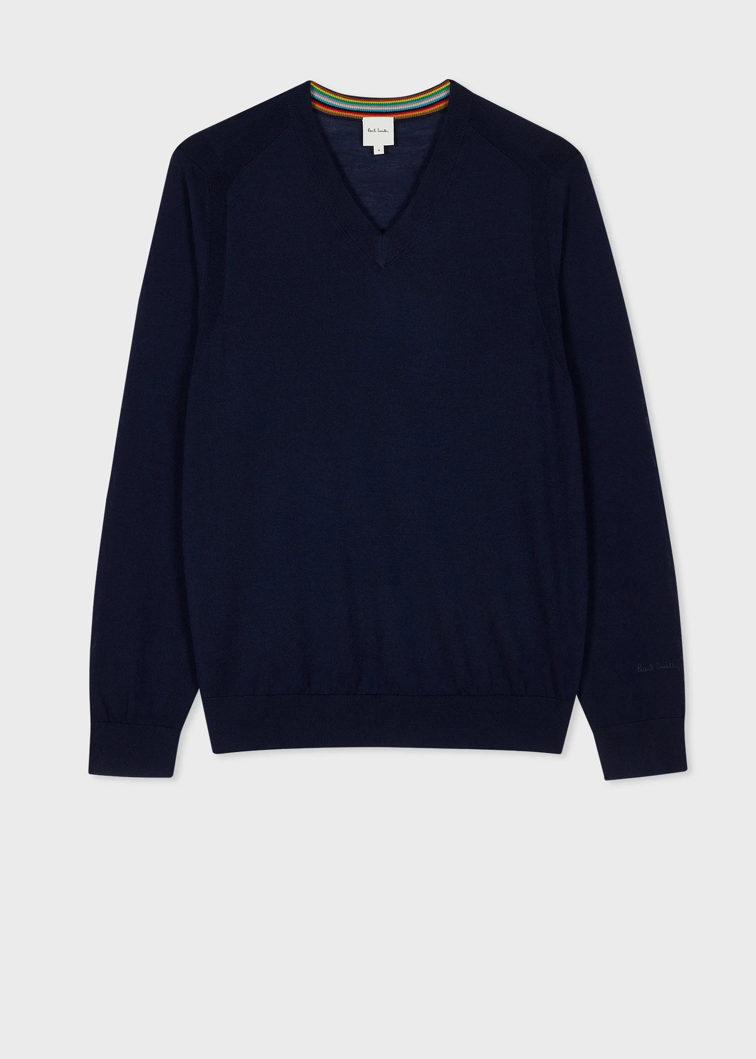 Made from soft 100% Merino wool, this navy V-neck sweater features a classic, minimalist design with signature stripe internal trim - for an added pop of colour. Finished with ribbed cuffs and waistband and an embroidered Paul Smith logo on the sleeve. 100% Merino Wool Hand wash or dry clean only The Size Model wears a size M Model measures: Height 6’’ / 183cm | Waist 30”/ 76cm The Fit Regular-Fit is relaxed through the body. Product Code: M1R-571X-M02093-49