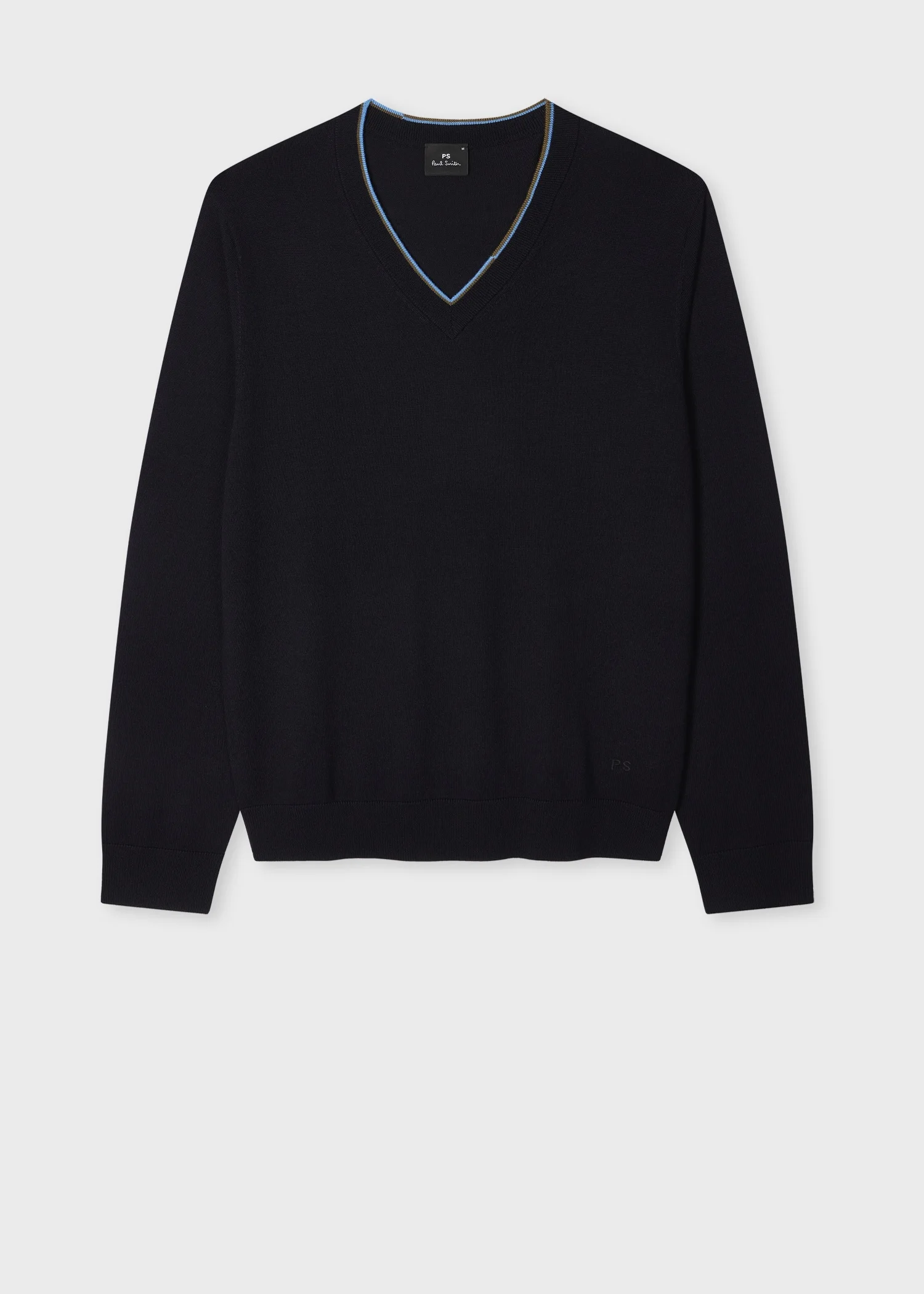 Made from 100% Merino wool for a soft, lightweight and breathable finish, this navy sweater features a classic V-neck shape. Complete with two-colour stripe tipping for an added twist, this sweater is finished with tonal initials embroidered at the hem. 100% Merino Wool Hand wash The Fit Regular-Fit Product Code: M2R-320Z-R22307-49