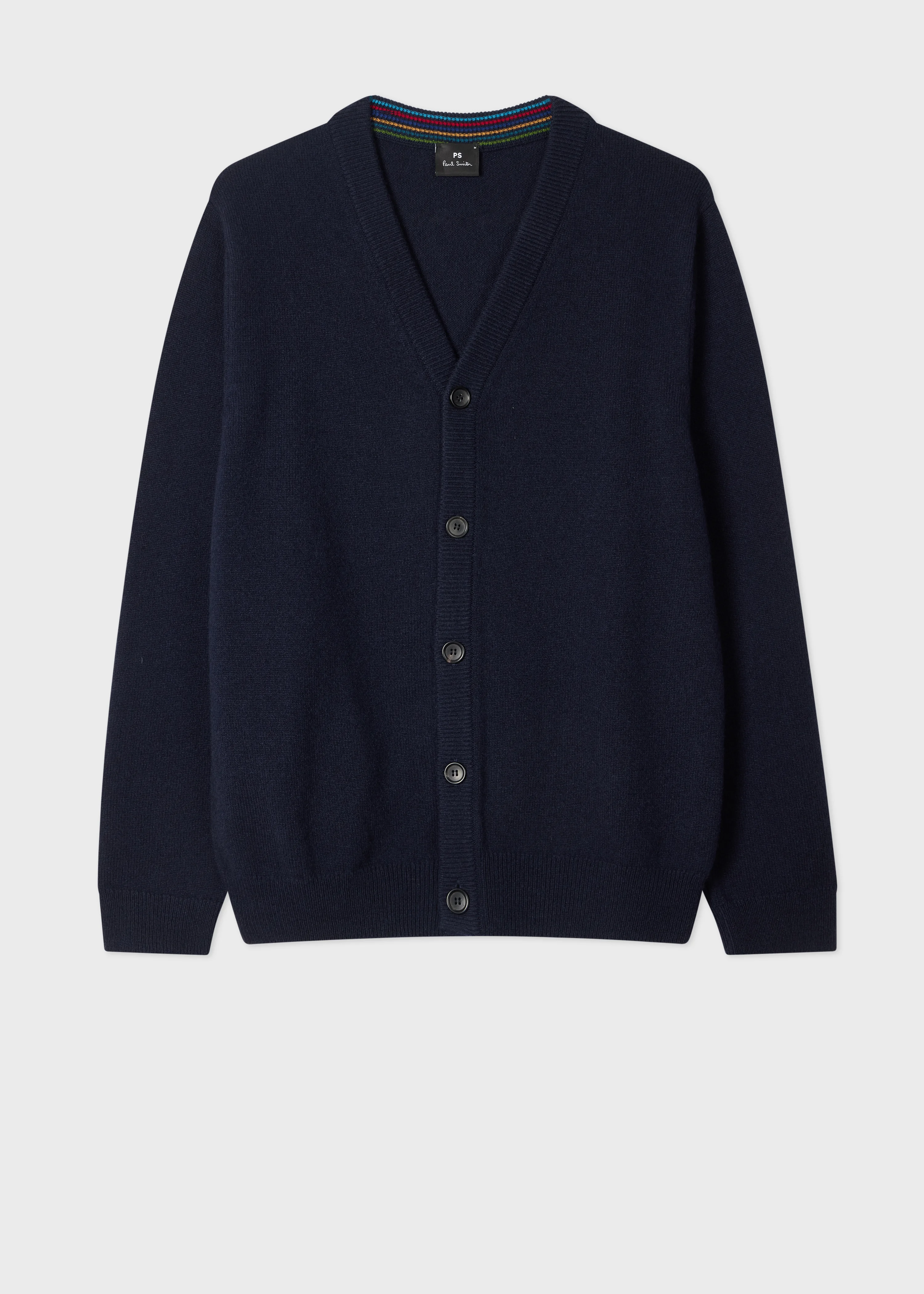 Made in Portugal from 100% merino wool, this navy cardigan features a classic V-neck design with five button placket. Cut for a regular-fit, this cardigan is finished with a 'Sports Stripe' collar trim - for a signature flash of colour. The Fit - Regular-Fit Product Code: M2R-488Z-T22514-49