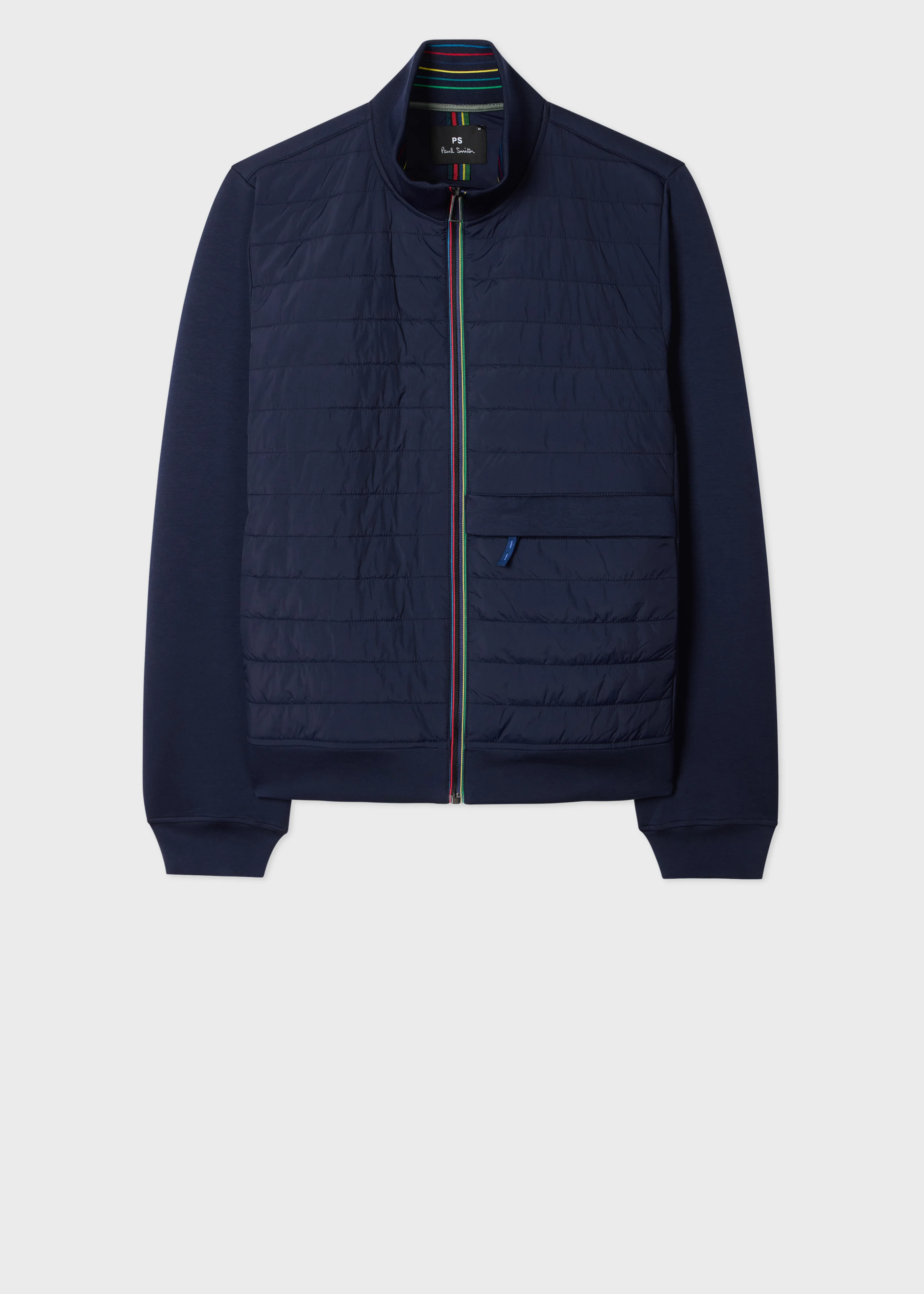 Made from recycled nylon, this navy jacket features a mixed media construction. Using a lightweight quilted front with insulated recycled wadding for warmth, the sleeves and back use a jersey construction allowing for added stretch and comfort. Finished with a 'Sports Stripe' zip fastening for a signature pop of colour. The Fit - Regular-Fit Product Code: M2R-884U-V22550-49