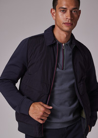 Crafted from 100% recycled nylon, this navy mixed media features a DWR showerproof finish and insulated recycled wadding for added warmth. Cut shorter in the body, this casual jacket is finished with tonal jersey sleeves - for an added twist. The Fit - Regular-Fit is relaxed through the body. Product Code: M2R-628Z-T22088-49A