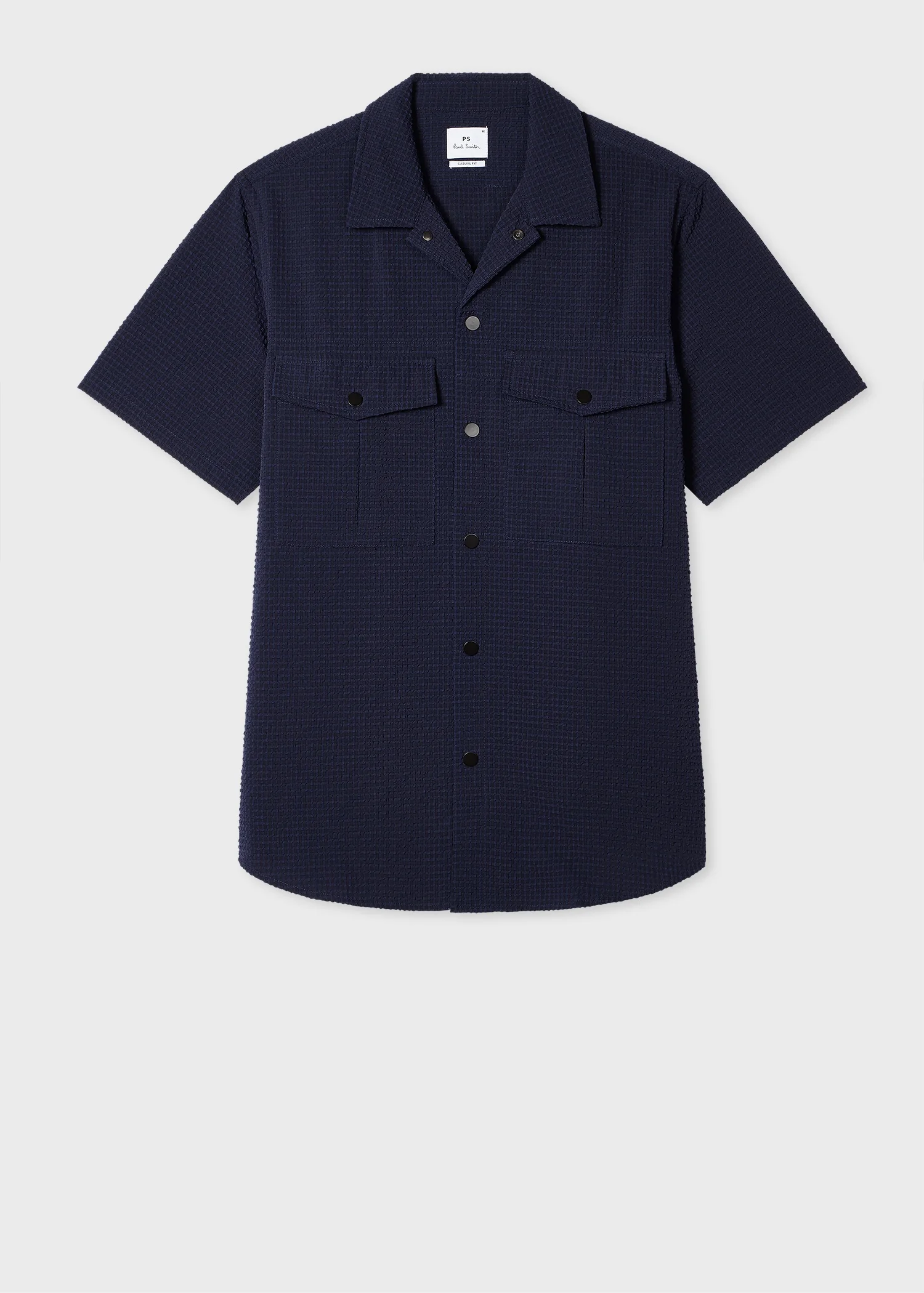 Made from a lightweight seersucker cloth with a textured finish and added stretch, this navy short-sleeve shirt offers both style and comfort. Featuring a classic casual fit, this versatile shirt is ideal for warm weather dressing. Finished with press-stud fastening and two chest pockets for added practicality. The Fit - Classic-Fit also known as Casual-Fit is relaxed through the body. Product Code: M2R-798Y-T22385-49