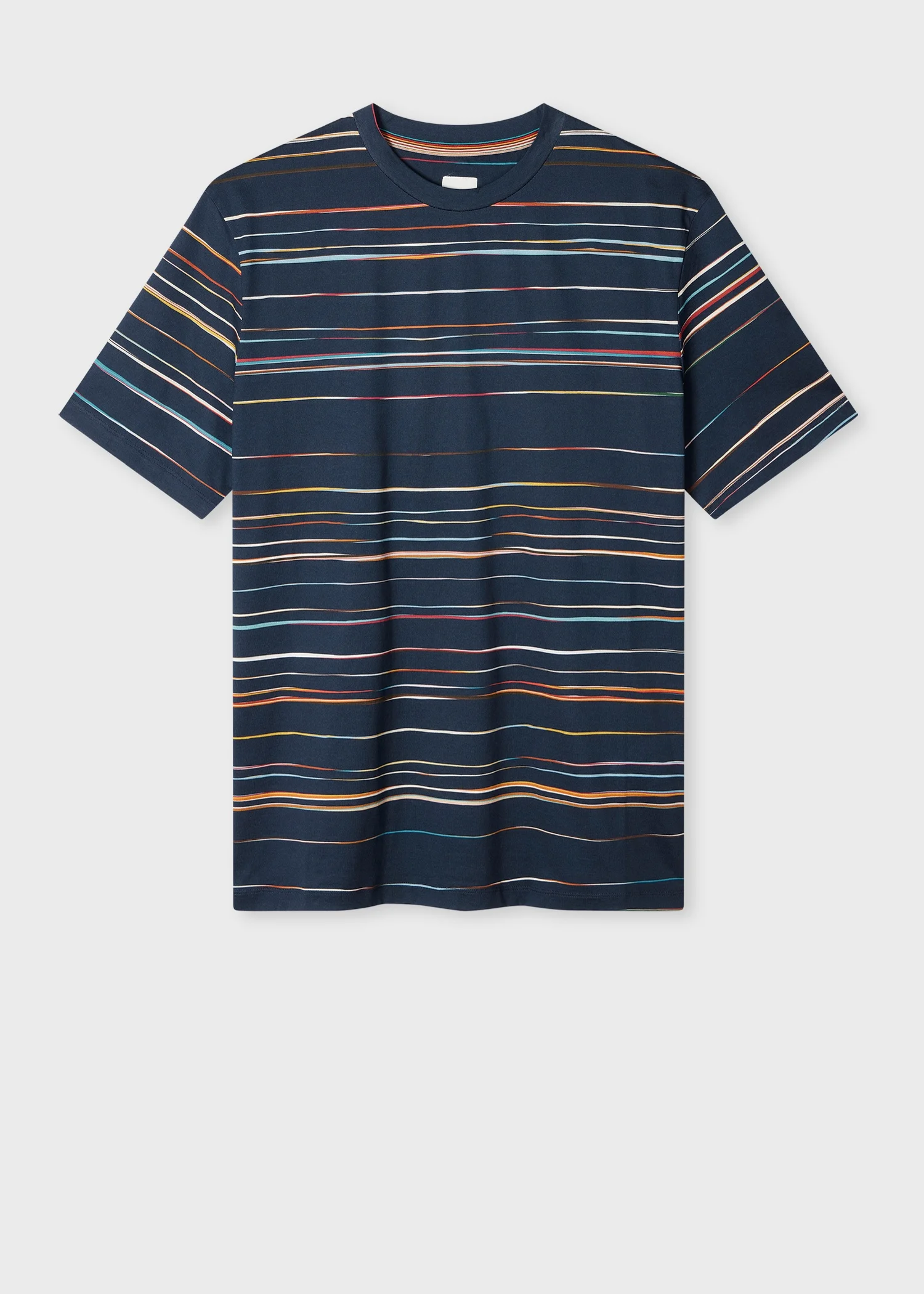 Made in Portugal from a premium 100% cotton, this navy T-shirt features a 'Signature Pinstripe' pattern throughout. Ideal for everyday wear, this T-shirt is finished with a classic crew neck. 100% Cotton Machine washable Made in Portugal The Fit Regular-Fit is relaxed through the body. Product Code: M1R-919T-TP5185-49