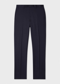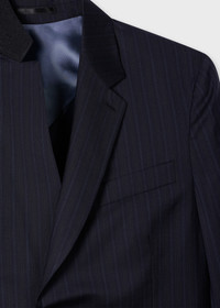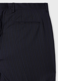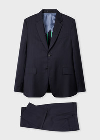 Made from a super 120s tropical wool for a lightweight, breathable finish, this navy two-piece suit features a subtle pinstripe pattern throughout. The blazer is complete with a buggy lining for added comfort and breathability. The trousers are cut for a tapered fit and are finished with an internal rubber grip on the waistband to keep the shirt secure when tucked in. Product Code: M1R-SUIT-T02705-49