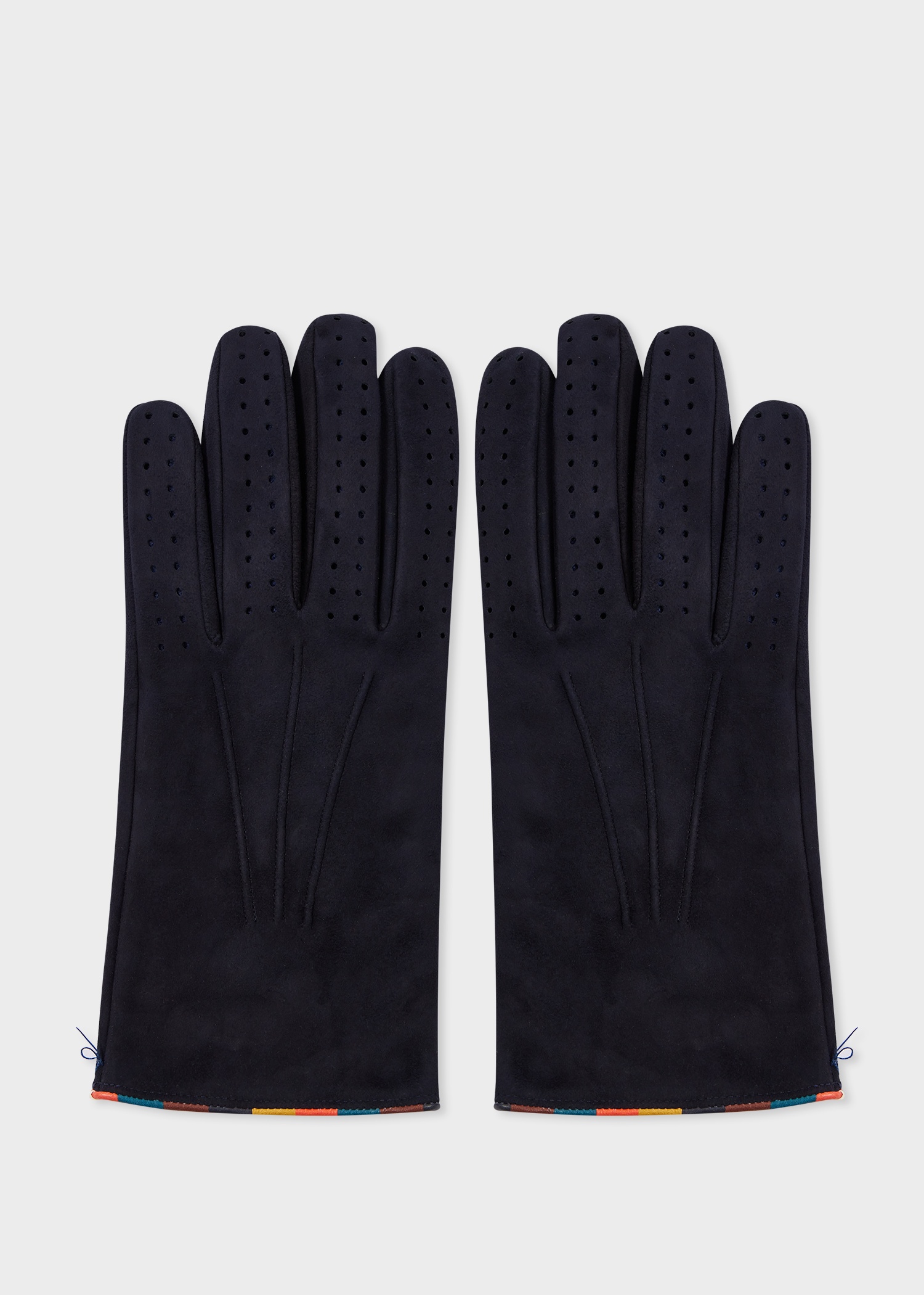 Made in Italy from a rich suede construction these navy gloves feature perforated fingers, 'Artist Stripe' trims, and embossed signature Paul Smith logo for instant brand recognition. 100% Lambskin Leather Specialist Dry Clean Only Made in Italy Product Code: M1A-415GL-N241-47