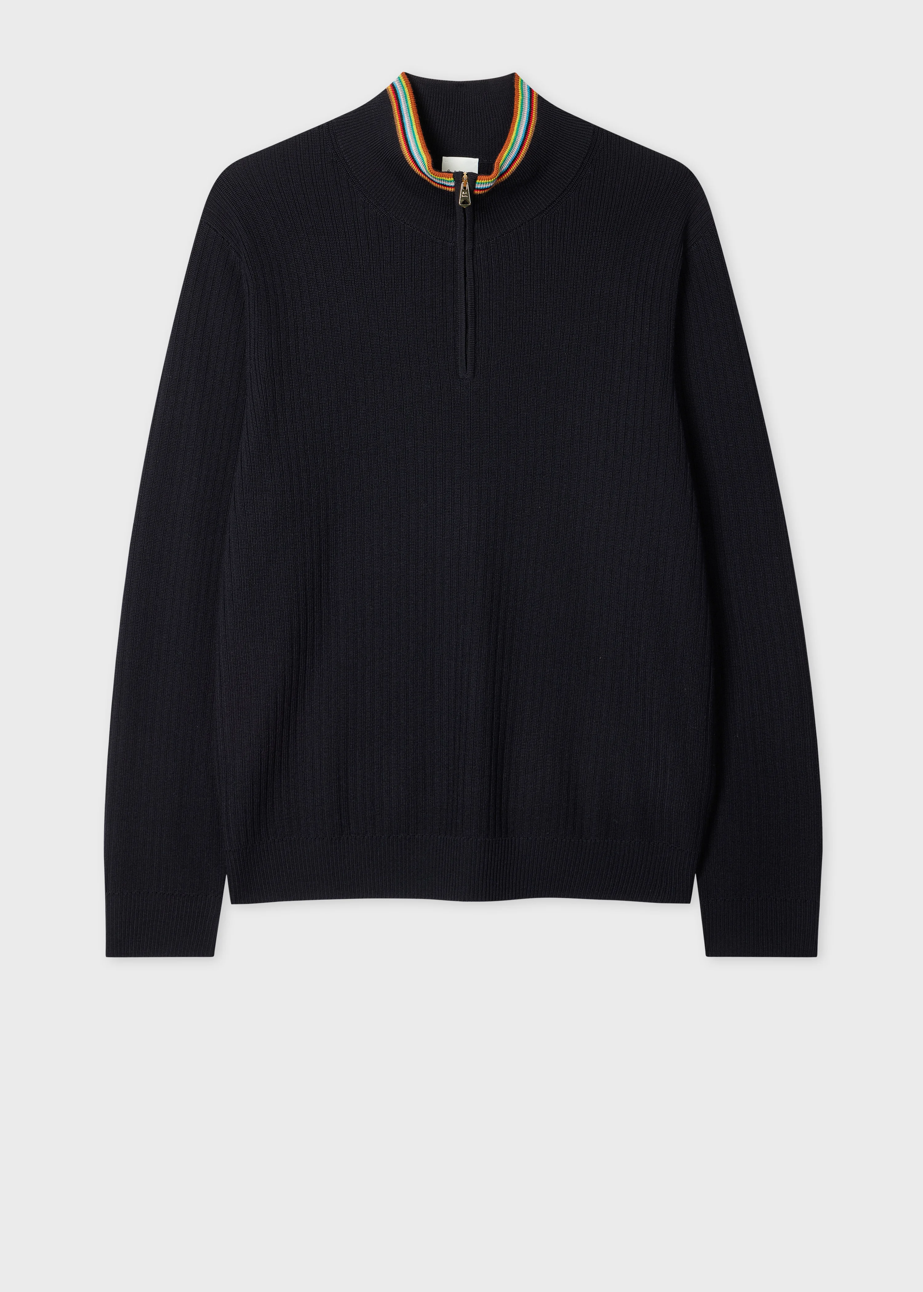 Made from a washable merino wool, this navy half zip sweater is the perfect transitional piece, adorned with 'Signature Stripe' intarsia detailing to the collar. Cut to a casual fit, this knit boasts a textured ribbed design throughout and ribbed hem, neckline, and cuffs for optimal fit. The Fit - Casual-Fit, is relaxed through chest and wider towards the hem Product Code: M1R-548Z-T02825-49