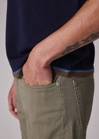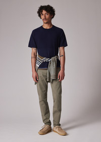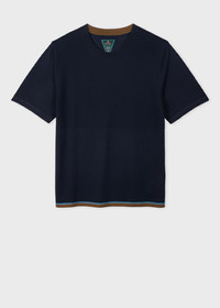 Made from 100% machine washable merino wool for easy care, this navy short-sleeve knitted T-shirt features a textured knit panel for a tactile finish. Complete with a ribbed collar and contrast khaki hem with blue flatlock stitching. 100% Merino Wool Machine washable The Fit Regular-Fit is relaxed through the body. Product Code: M2R-479Z-T22438-49