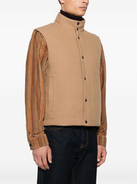 padded gilet Highlights - Camel brown - Wool/down-feather filling - Interlock weave - Padded design - Front press-stud fastening - High neck - Sleeveless - Two side slit pockets - Internal slip pocket - Internal zip-fastening pocket - Quilted lining - Straight hem Imported Composition Outer: Wool 100% Lining: Viscose 100%, Duck Down 90%, Duck Feathers 10% SIZE & FIT Model measurements Height 6 ft 1 in(1.85 m) Bust/Chest 35.82 in(91 cm) Hips 37.79 in(96 cm) Waist 29.13 in(74 cm) FittingInformation Designed for a slim fit, offering a comfortable fit that sits just away from the body Made from a padded non-stretch fabric, giving it no natural elasticity