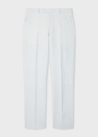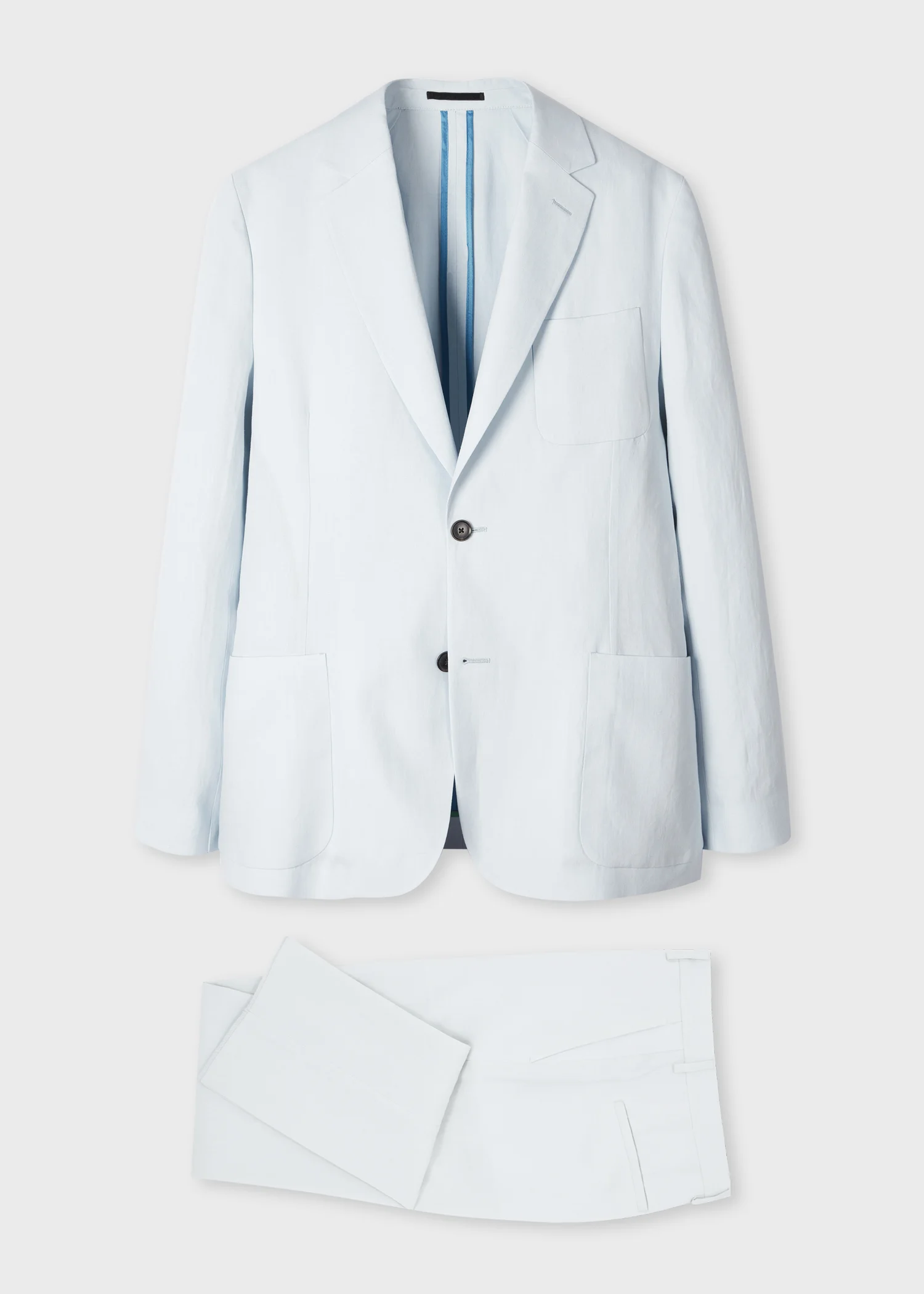 Made in Portugal from 100% pure linen, this two-piece suit features a timeless, summer-ready pale blue tone. The blazer features patch pockets and a lightweight, unlined construction for a breathable feel. Ideal for a warmer climate, the classic two-button design. The trousers are cut for a tapered fit with a narrow hem. Product Code: M1R-SUIT-R01427-41