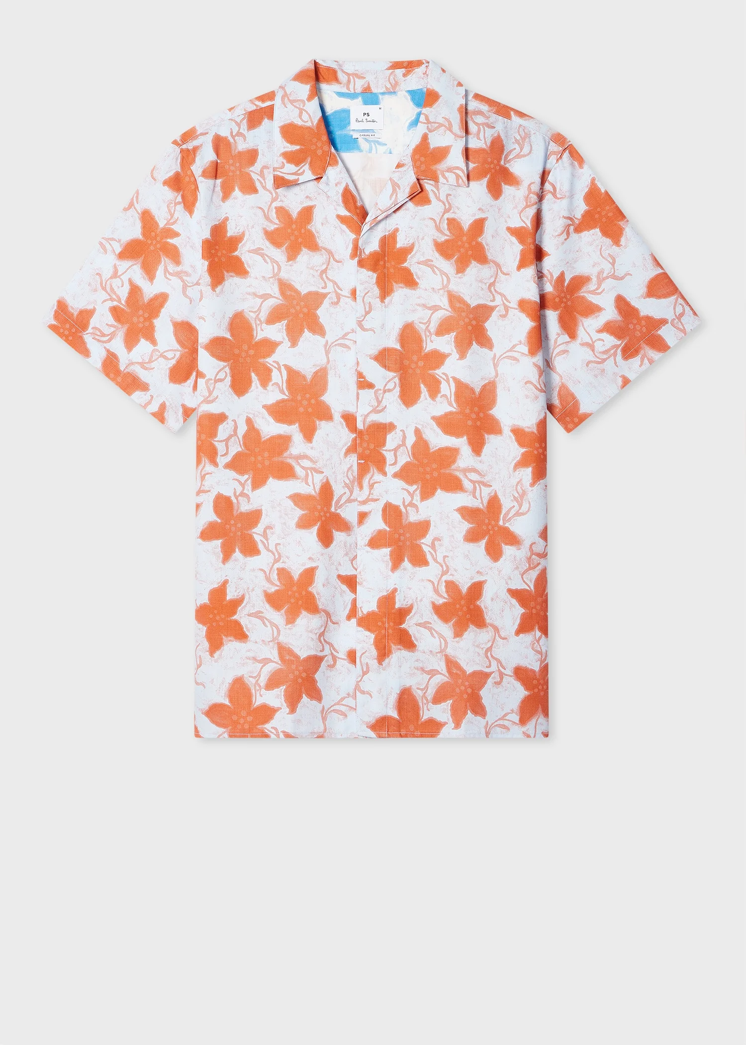 Made from a lightweight lyocell and cotton-blend, this pale blue short-sleeve shirt features an orange 'Gentian Flower' print throughout. Designed with a casual fit for effortless summer styling, this shirt can be paired with shorts or chinos for a relaxed yet refined look. The Fit - Classic-Fit also known as Casual-Fit is relaxed through the body. Product Code: M2R-614Z-T22409-40