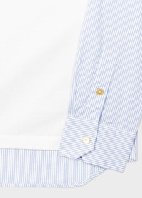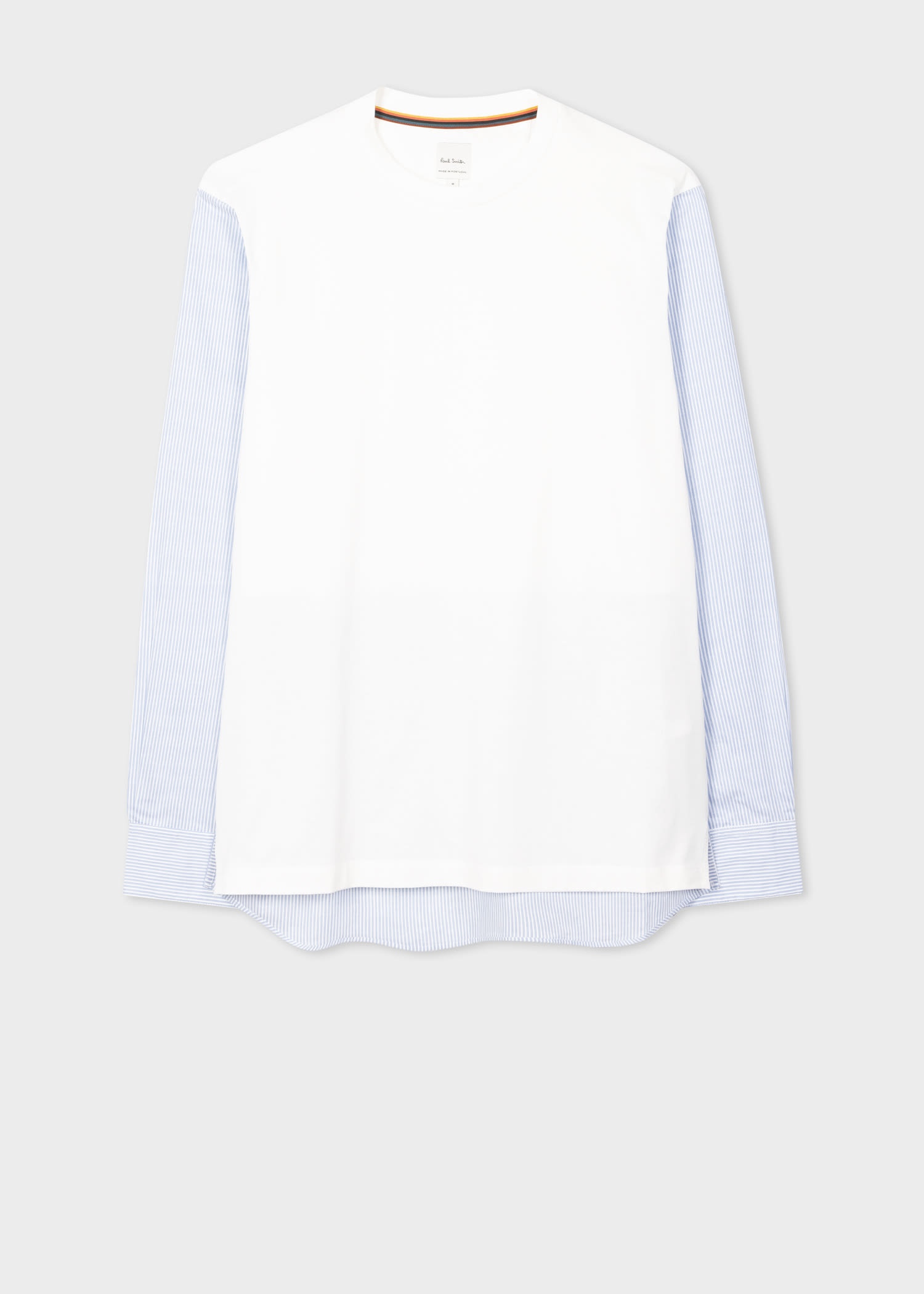 Crafted in Portugal from 100% cotton, this white long-sleeve T-Shirt features a panelled shirt stripe design with a contrasting stripe hem at the back. Finished with shell buttons throughout. 100% Cotton Made in Portugal Machine washable Product Code: M1R-029Y-K01688-01