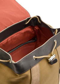 Info & Care Paul Smith canvas backpack; Leather top handle and trims, adjustable padded;canvas;shoulder straps, two side slip pockets, debossed logo at front, mesh panel at back, internal slip and zip-fastening pocket, fully lined Adjustable buckle flap front with concealed drawstring fastening; Size & Fit Width: 12 inches/ 30.5cm Height: 14 inches/ 35.5cm Depth: 7 inches/ 18cm Top handle drop: 3.5 inches/ 9cm