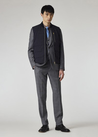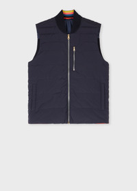 The perfect companion for the transitional season, this hybrid gilet features a mixed-media construction for elevated styling. The front panel is filled with down for warmth, while the back panel is made from a knit cotton construction for a breathable feel. The gilet is complete with a ribbed neckline, zip fastening with tie-shaped zip pulls, and interior pockets for added storage. A chest pocket adds functionality, while the interior neckline and back are detailed with 'Artist Stripe' accents for a distinctive touch. 87% Nylon, 13% Elastane Cloth 2: 100% Cotton Lining: 100% Polyester Filling 80% Recycled Down, 20% Recycled Feather Dry Clean Only The Fit Regular-Fit is relaxed through the body. Product Code: M1R-402Z-P01501-47