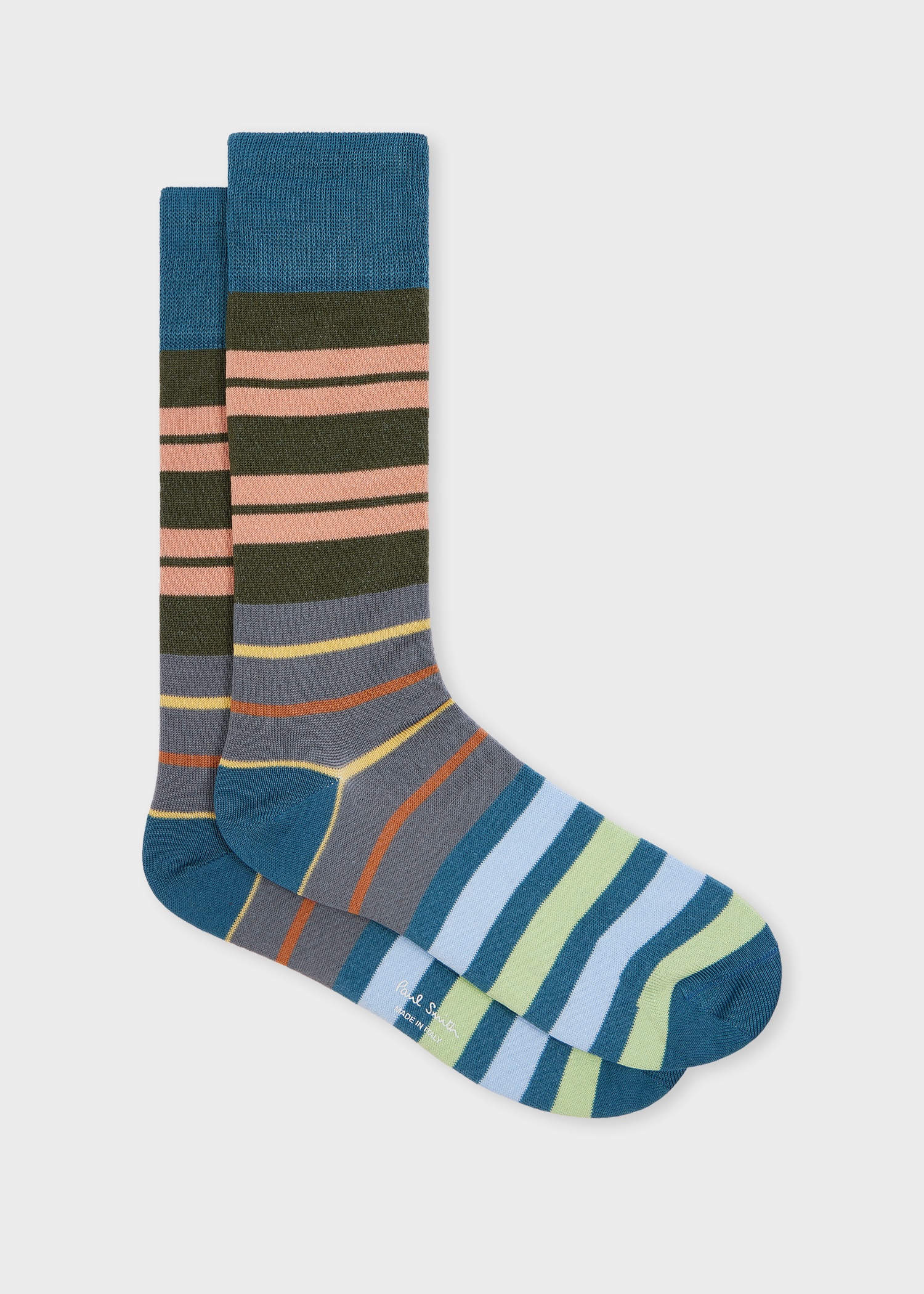 Made in Italy, these blue mixed stripe socks feature an array of bold or subtle multicolor stripes. Crafted from a cotton blend for added stretch, the sock is complete with subtle signature branding. 80% Cotton, 18% Polyamide, 2% Elastane Machine washable Made in Italy Product Code: M1A-800MO-P349-37