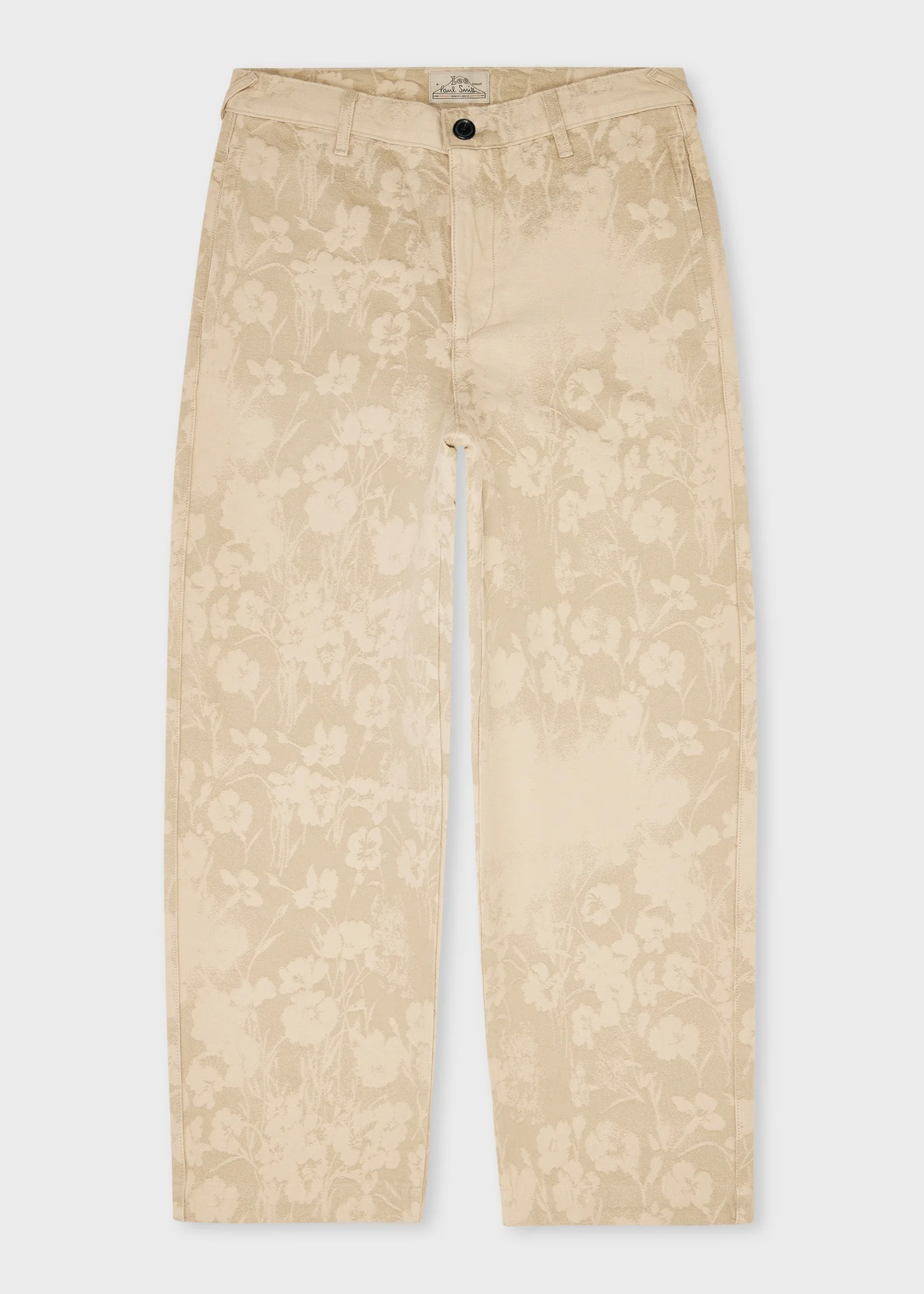Made from 100% cotton, this addition to the Paul Smith + Lee® line combines good tailoring with an artistic spirit. The jacquard trousers sophisticated stitching and welt pockets give it a traditional feel, while the unique pattern of poppies in-bloom offers a nod to Paul Smith's 'classic with a twist' inspiration. Pair them with the collarless chore coat or wear them as a statement piece all on their own. [b]Paul Smith + Lee®[/b] We enlisted six friends of Paul Smith – two musicians, a photographer, a dancer, a painter, and a lawyer – to demonstrate the collaboration’s easy-going appeal. [b][url="discover/collaborations/lee"]Discover More[/url][/b] 100% Cotton Machine washable [b]Please note for legal reasons this product cannot be shipped to India. Any orders processed will be cancelled and refunded.[/b] The Size Model wears a size 32 Model measures: Height 6’1’’ / 186cm | Chest 37 ½ ’’ / 95cm | Waist 30’’ / 76.5cm The Fit Fit: Loose Rise: Mid Leg: Tapered Product Code: M1R-TAPER-PJACFL-60