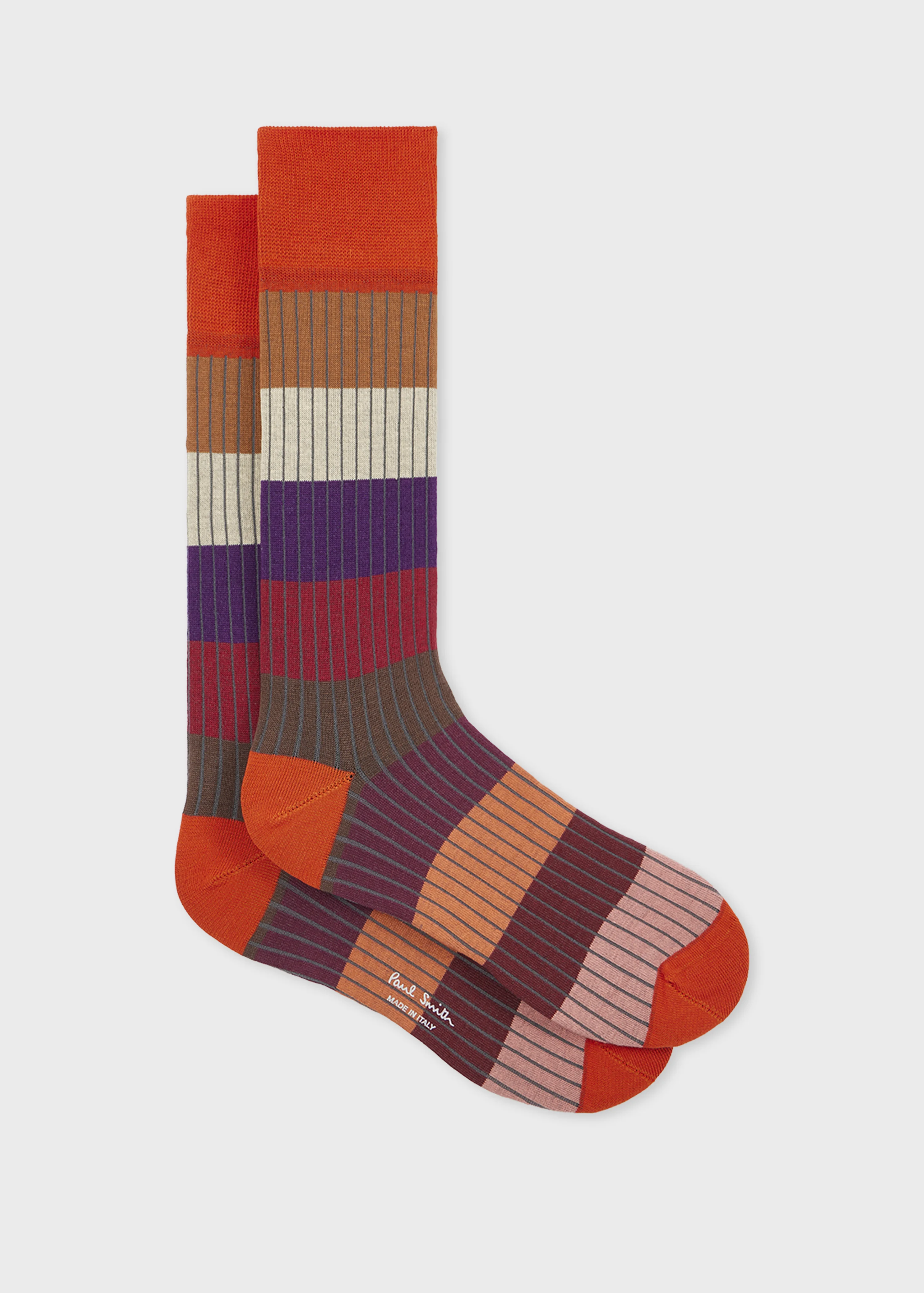 Made in Italy from a soft cotton-blend, these socks feature a multicolour block stripe pattern throughout, with rib detailing. Finished in a red colourway, they are perfect for adding tonal colour to your everyday look. Product Code: M1A-380CI-T693-25