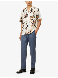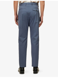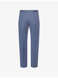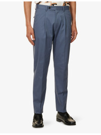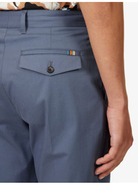 PRODUCT DETAILS - Paul Smith stretch-cotton trousers - 96% cotton, 4% elastane; lining 70% cotton, 30% polyamide - Concealed button, hook-and-eye and zip-fly fastening at front - Regular fit, high-rise, tapered leg, belt loops, two slip pockets and pleated at front, welt and buttoned pockets at back - Machine wash cold - Size UK 30: rise 13in / 33cm, inside leg 30in / 77cm, leg opening 14in / 36cm - Model is 6ft 2in/1.88m and wears a size UK 30 - Lightweight, slight stretch Ref: R04465837