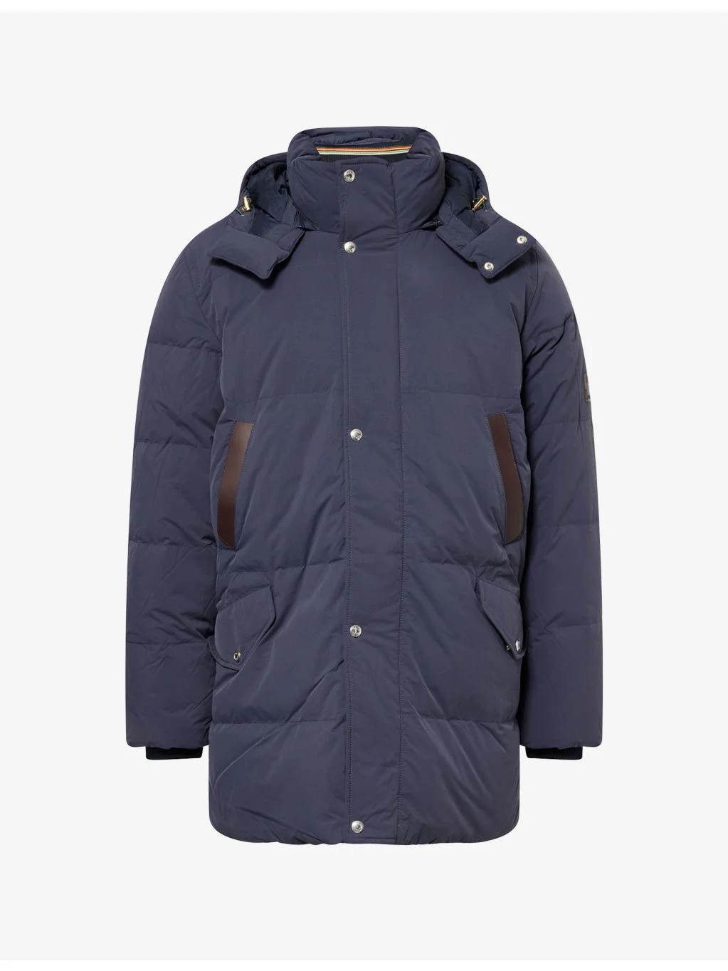 PRODUCT DETAILS - Paul Smith woven-down coat - 100% polyamide; filling 80% down, 20% feathers; lining 100% polyester - Concealed popper fastening at front - Relaxed fit, high-neck, detachable drawstring hood, long sleeves, brand print at sleeve, internal ribbed cuffs, two buttoned pockets and two welt pockets at front, all-over quilted and padded, fully lined, drawstring hem - Dry clean - Size medium: length 33in / 85cm, chest 46in / 117cm - Model is 6ft 2in/1.88m and wears a size medium - Midweight, non-stretch Ref: R04528487