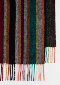 This super-soft lambswool and cashmere blend scarf features a muted 'signature stripe' pattern allover, and is finished with raw edges and tasseled ends. Size: 180cm x 25cm 95% Lambswool, 5% Cashmere Dry clean only Made in England Product Code: M1A-150K-J204-92