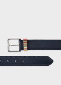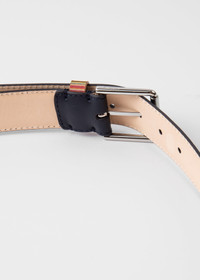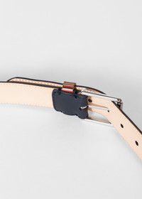 Men's navy leather belt with a signature stripe keeper. Made in Spain from a smooth leather, this belt is finished with a silver buckle and a natural leather lining. Belt Width: 3.5cm 100% Leather with 100% Zamac Buckle Made in Spain Please note all Monogrammed items are non-returnable. Product Code: M1A-4950-BMULKE-47