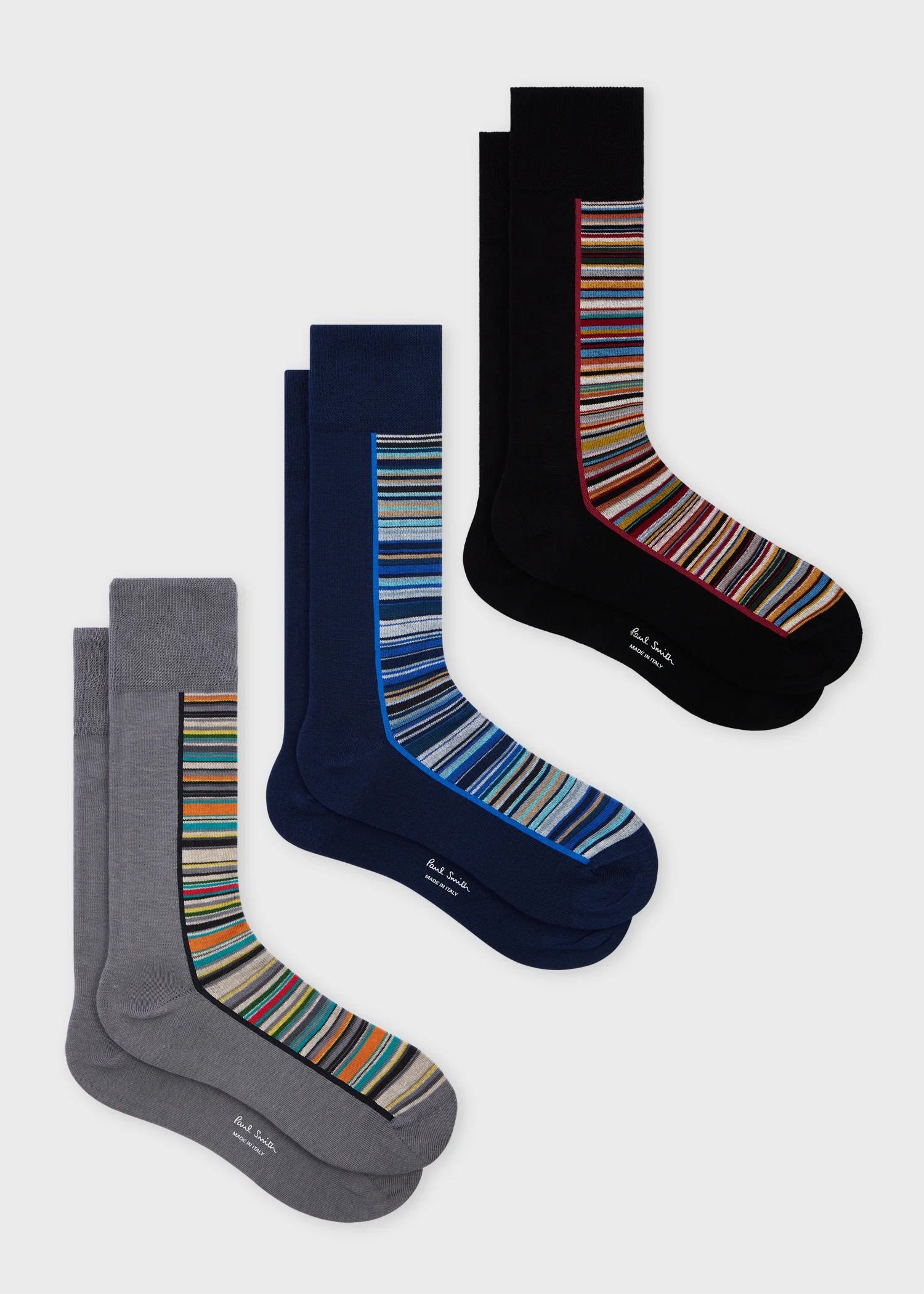 Made in Italy from a soft cotton blend with silk, this three-pack of men’s socks features a panel ‘Signature Stripe’ design for a subtle pop of colour. Product Code: M1A-SOCKX-T3ZAL1-1A