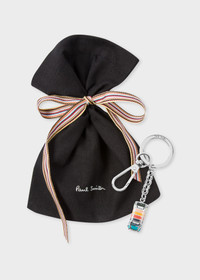 The perfect gift for Paul Smith and car enthusiasts alike, this metal keyring features a 'Mini' silhouette, in our classic 'Artist Stripe' colours. This accessory comes complete with a silver clip fastening and etched key hoop, presented in a black Paul Smith gift-pouch. Approx length: 13cm 90% Copper, 10% Zinc with 100% Enamel Plate Product Code: M1A-KEYR-AMINIC-97