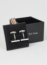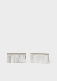 Rectangular cufflinks with a mother of pearl striped insert and polished silver surround with Paul Smith logo. Finished with logo embossed T-bar fastenings and presented in a black gift-box. 90% Copper, 10% Zinc with 100% Mother of pearl plated Product Code: M1A-CUFF-PMOPS-82