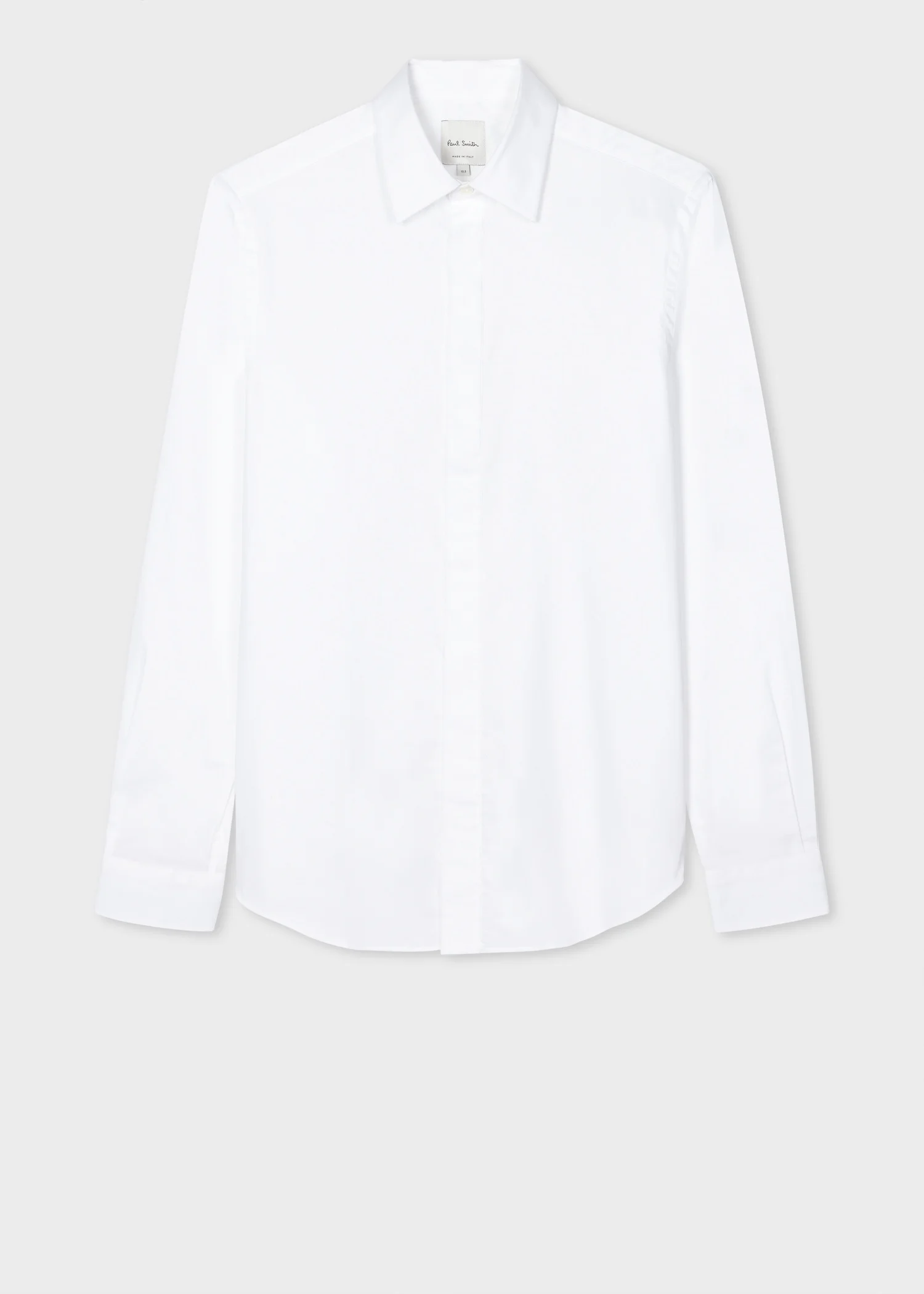 Made in Italy, this easy-iron white long-sleeve shirt is made from 100% cotton twill with a subtle diagonal design and is complete with a fly front for a clean, formal look. Complete with a contrasting 'Artist Stripe' cuff lining. 100% Cotton Made in Italy Machine washable Product Code: M1R-656U3-L01918-02