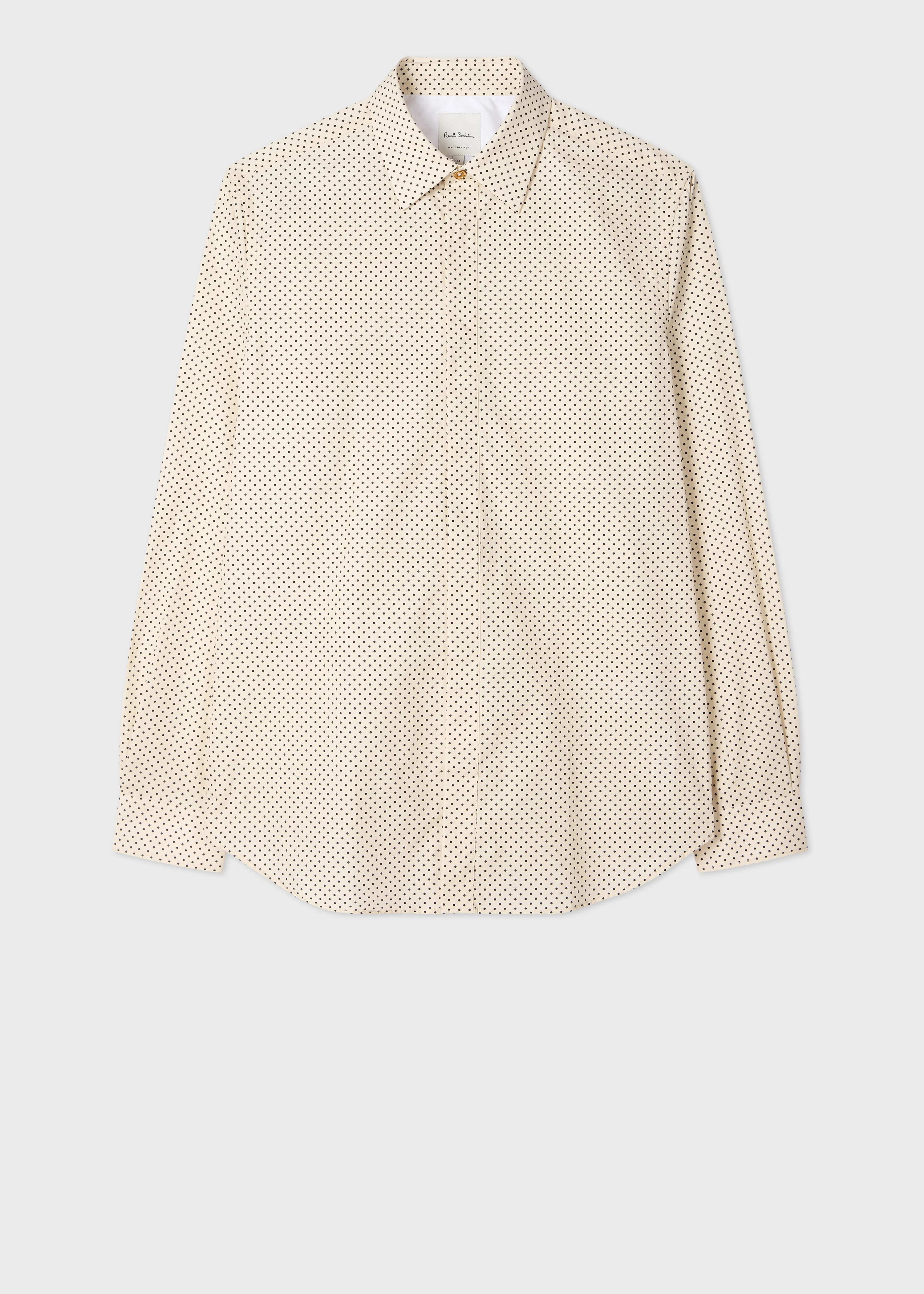 Made in Italy from premium 100% cotton, this long-sleeve shirt features an ecru base with a black polka dot pattern throughout. Cut for a slim-fit, this shirt is finished with a gold top button and a curved hemline. The Fit - Slim-Fit Product Code: M1R-656U-V02920-06