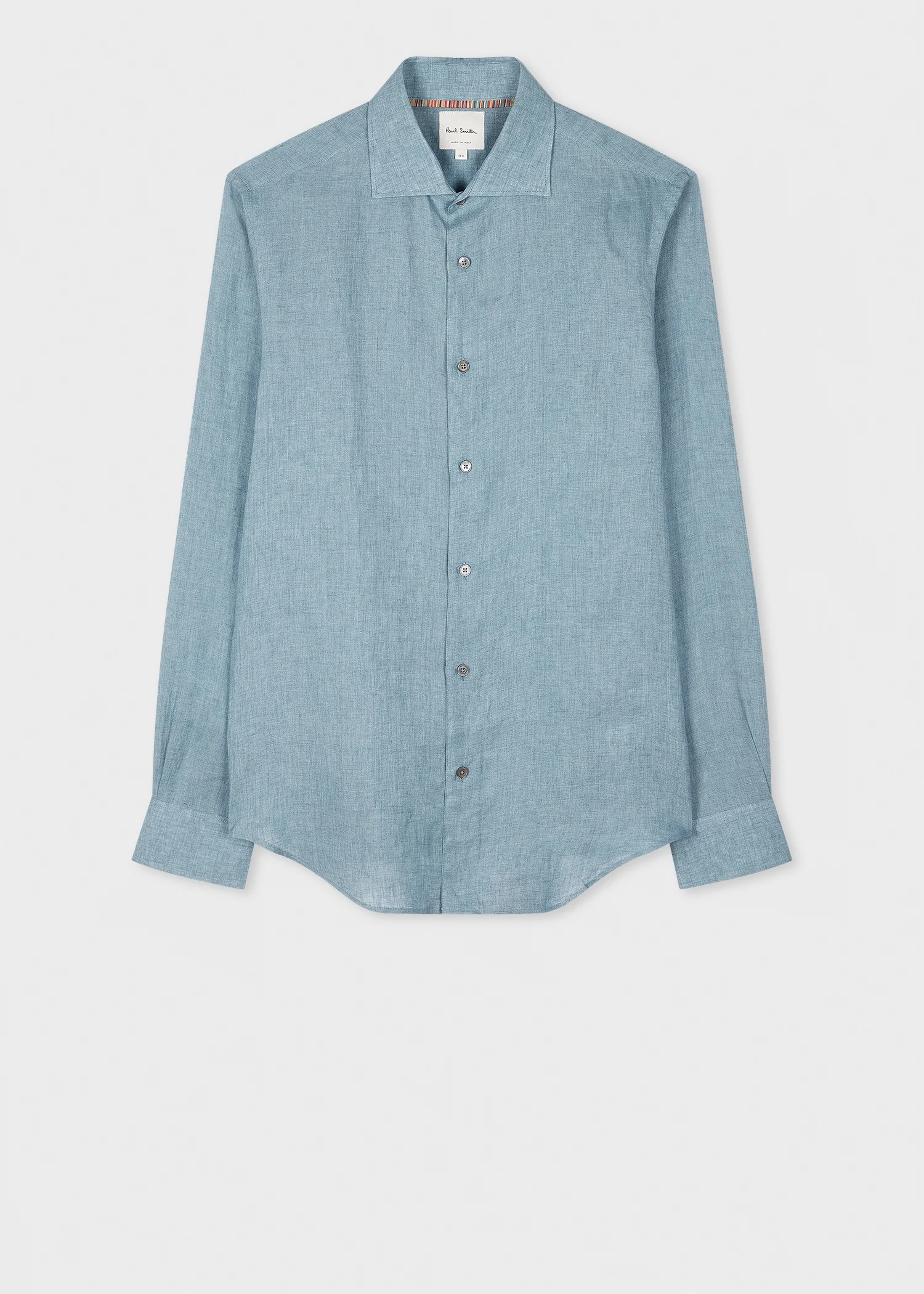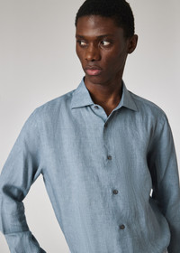Made in Italy from lightweight linen for a breathable finish, this light blue long-sleeve shirt features classic styling. Cut for a slim-fit, this shirt is finished with a cut-away collar and tonal stitching and buttons. 100% Linen Machine washable Made in Italy The Fit Slim-Fit is cut for a close fit through the body. Product Code: M1R-790Y-P01656-40