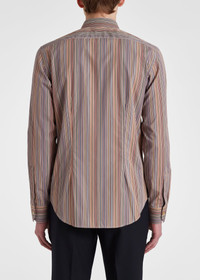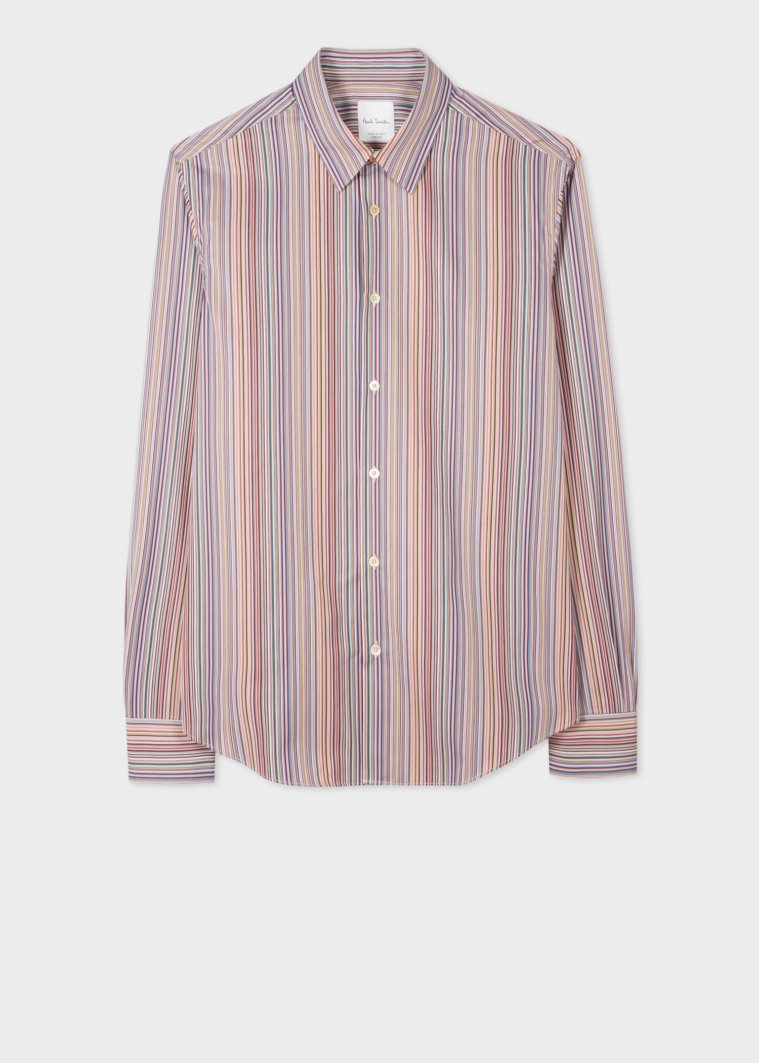 Crafted in Italy from 100% cotton, this long sleeve shirt features a woven 'Signature Stripe' pattern all-over. Cut for a slim-fit, this piece is complete with shell buttons throughout. Finished with a soft point collar with a gold top button, single cuffs and a curved hemline. 100% Cotton Machine washable Made in Italy Product Code: M1R-006L-L00811-92