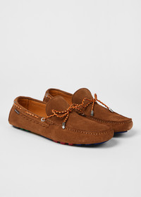Made in Portugal from soft suede, these slip-on tan 'Springfield' classic driving shoes feature true moccasin construction with a single piece of leather for flexibility. These driving loafers are expertly finished with multi-coloured 'Sports Stripe' lugs on the outsole. 100% Leather Uppers 100% Rubber Soles Made in Portugal Product Code: M2S-SFD21-KSUE-62