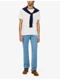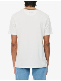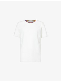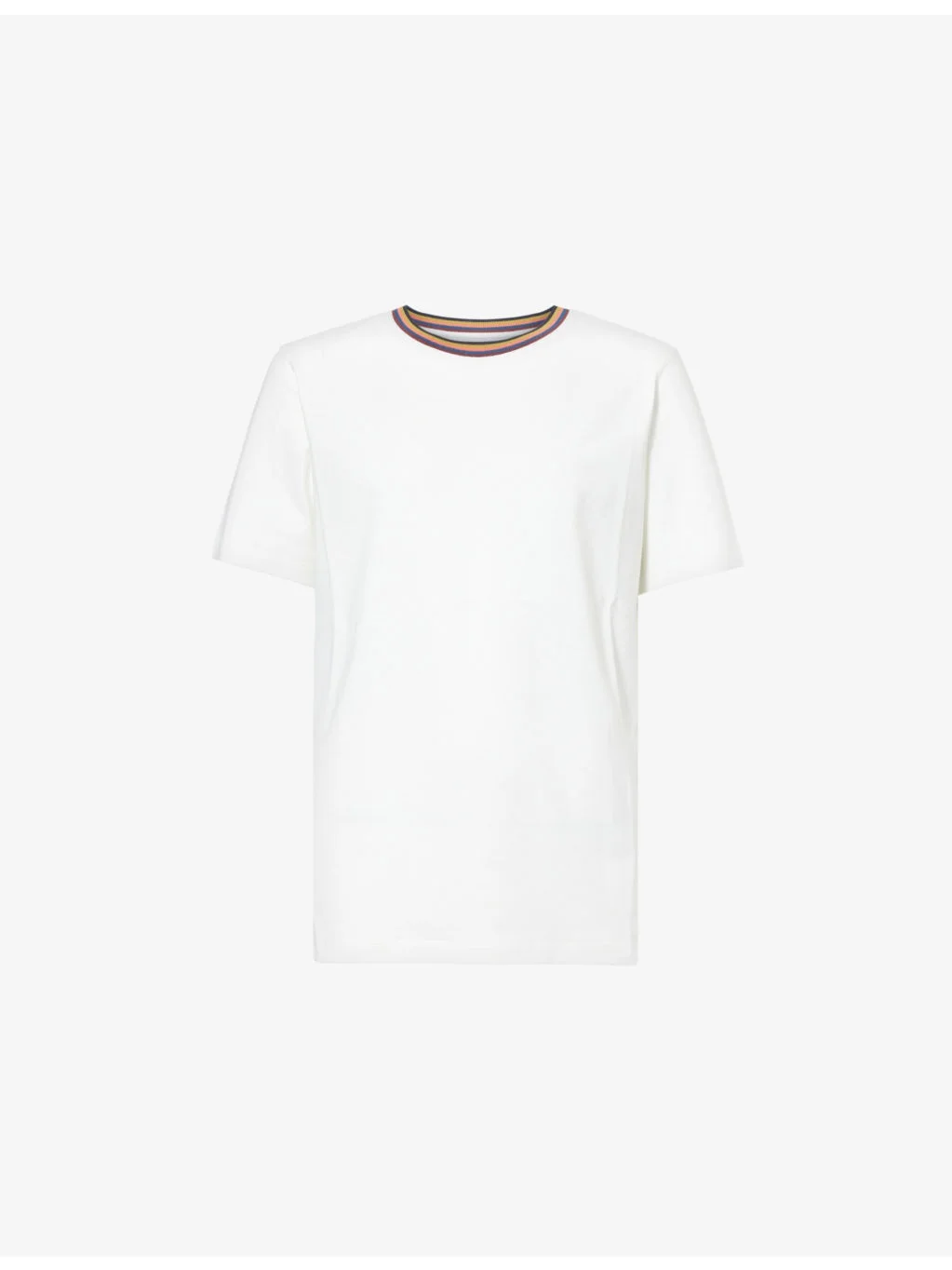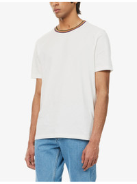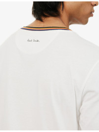 PRODUCT DETAILS - Paul Smith organic cotton T-shirt - 100% organic cotton - Pulls on - Regular fit, crewneck, stripe ribbed trim at neck, short sleeves, brand text print at back, all-over soft marl, split at hem sides with stripe trim, slight dipped hem - Machine wash cold - Made in Portugal - Model is 6 ft 2 in/1.88 m and wears a size medium - Lightweight, slight stretch