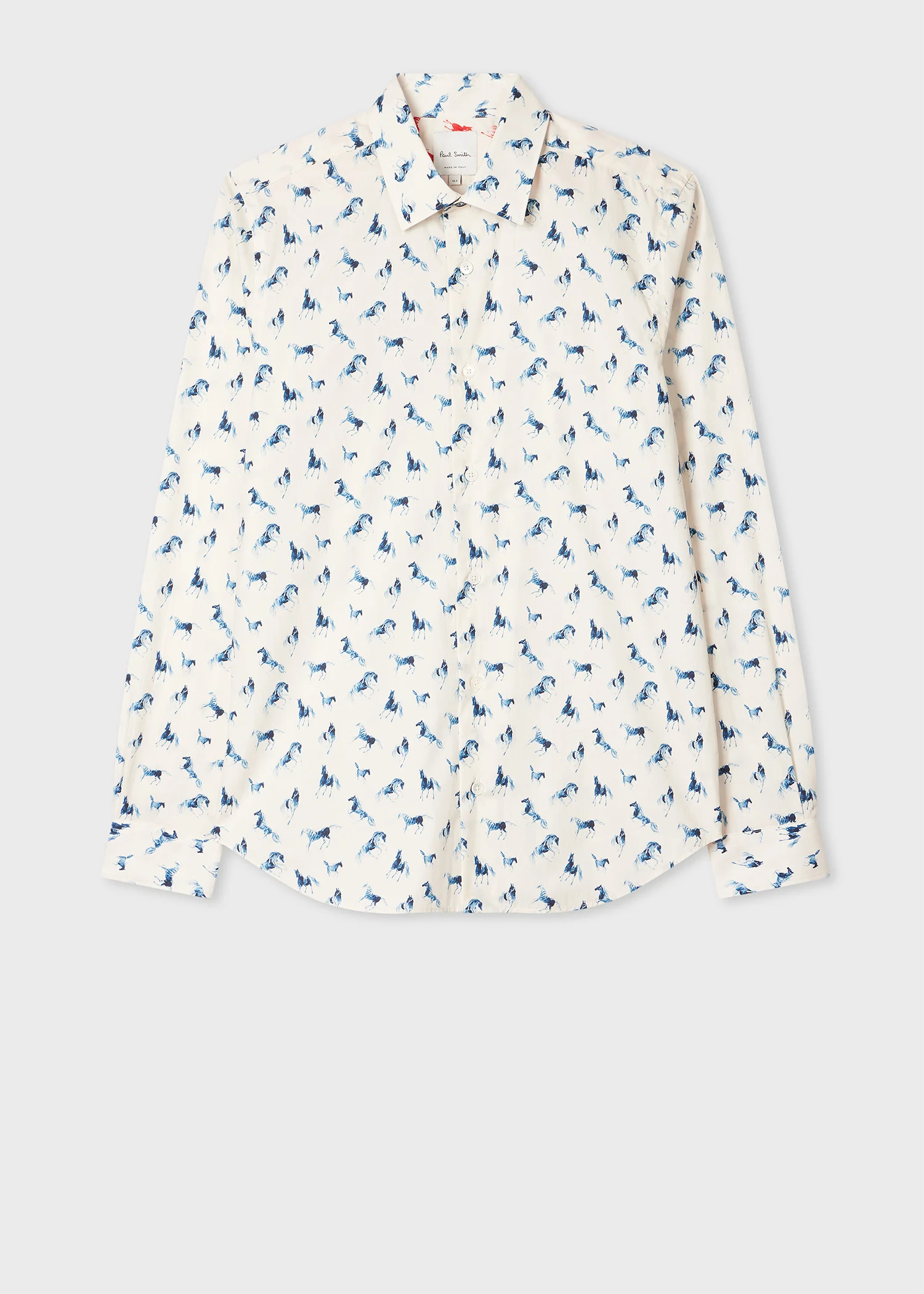 Created in celebration of Lunar New Year 2026 - the year of the Horse - this shirt features a white cotton base with the blue horse motif repeating throughout. Made in Italy, this shirt is cut for a super slim-fit and is finished with contrast colour cuff lining - for a signature twist. The Fit - Super Slim-Fit - Features high rear darts and subtle pleats near the wrists - Fits closely around the arms, back and torso Product Code: M1R-170R-T02866-41