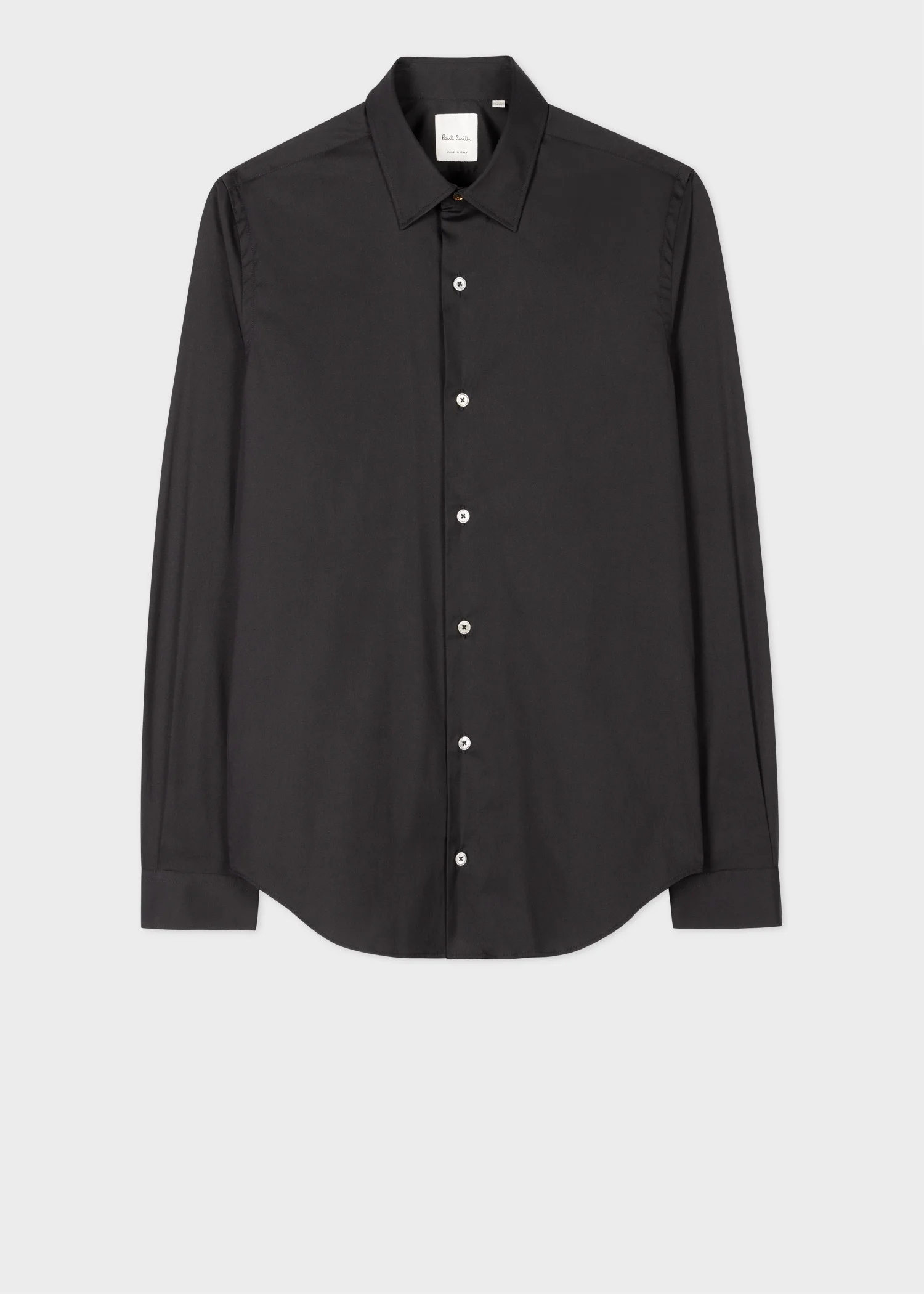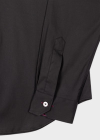 Crafted in Italy from a lightweight cotton-blend, this long-sleeve black shirt is cut in a super slim-fit with colourful 'Artist Stripe' cuff lining. Featuring a point collar with removable bones, this piece is finished with contrasting gold-tone top button and shell buttons used throughout. Woven, 78% Cotton, 20% Nylon, 2% Elastane Machine washable Made in Italy Product Code: M1R-170R3-L00051-79