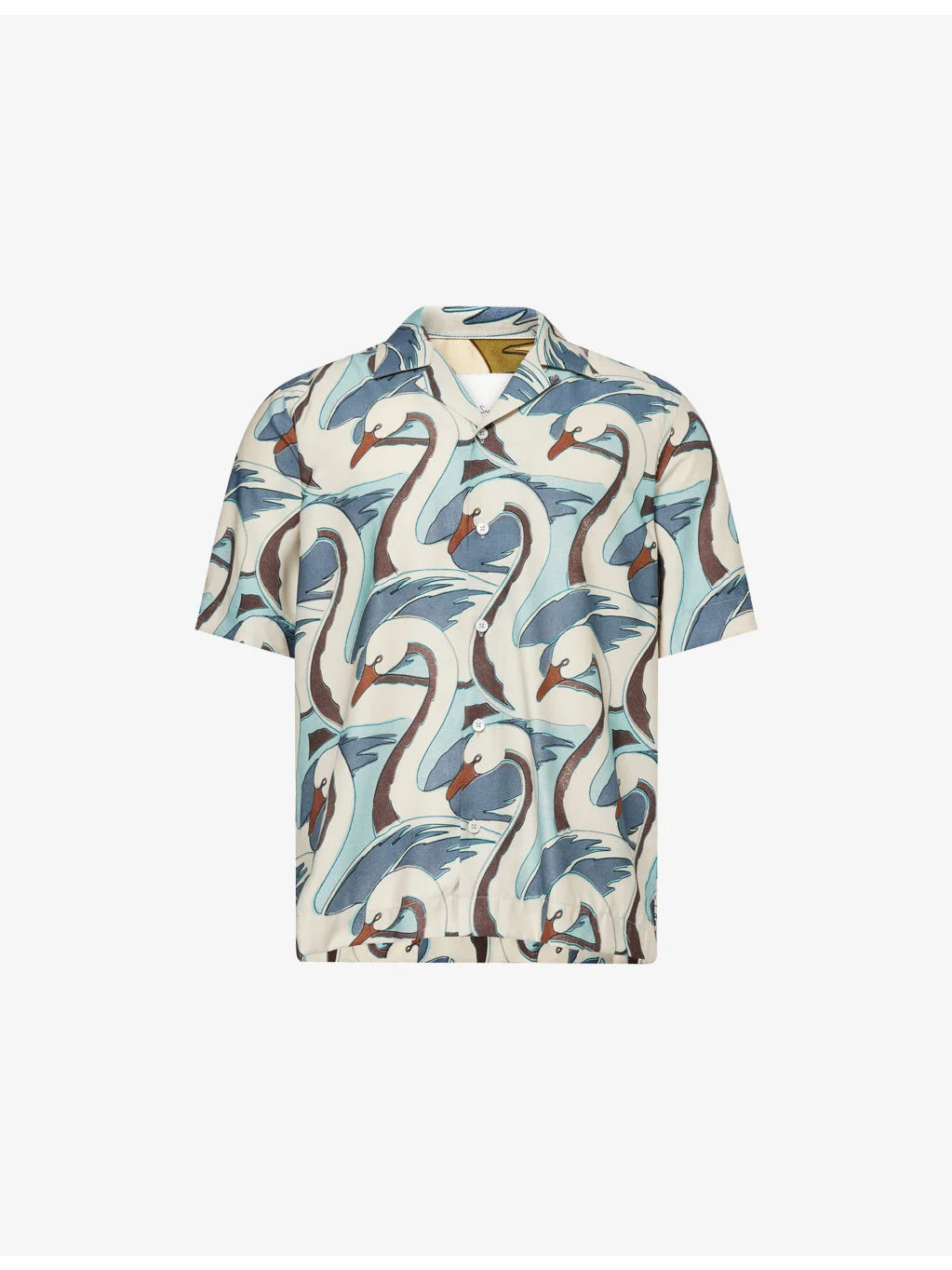 PRODUCT DETAILS - Paul Smith woven shirt - 90% viscose, 10% polyamide - Button fastening - Notched collar, short sleeves, all-over swan graphic print , straight hem - Dry clean - Made in Italy - Size medium: length 32.6in / 76cm, chest 39.3in / 100cm - Model is 6ft 2in/1.88m and wears a size medium - Lightweight, non-stretch Ref: R04536661