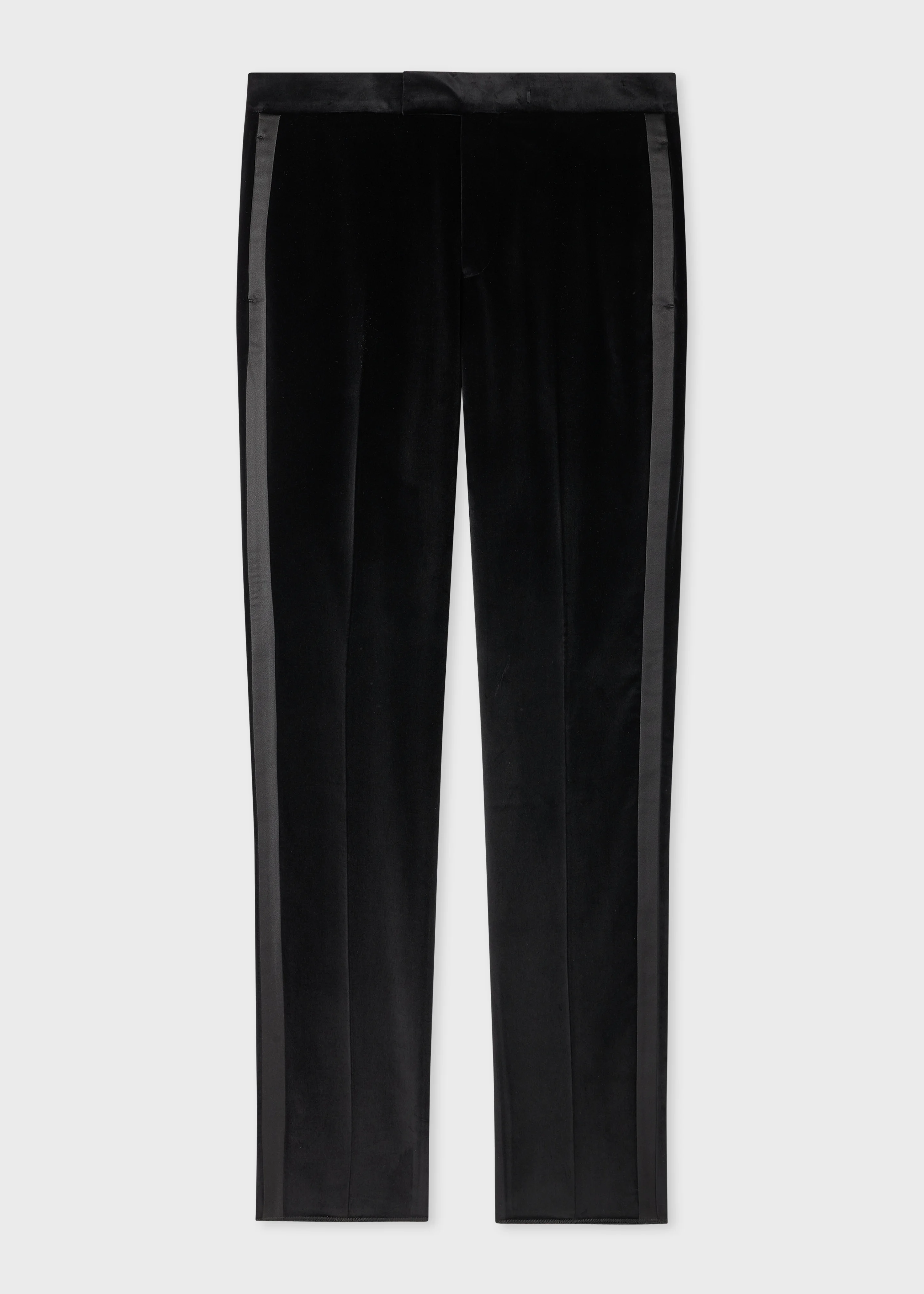 Made in Italy from a premium velvet cloth which is woven from very fine cotton yarns to result in a compact, fluid and silky finish - these black trousers feature tonal satin side stripes. Cut in our Brierley shape, these trousers are finished with on-seam side pockets. The Fit - Tailored-Fit Product Code: M1R-887Z-V01346-79