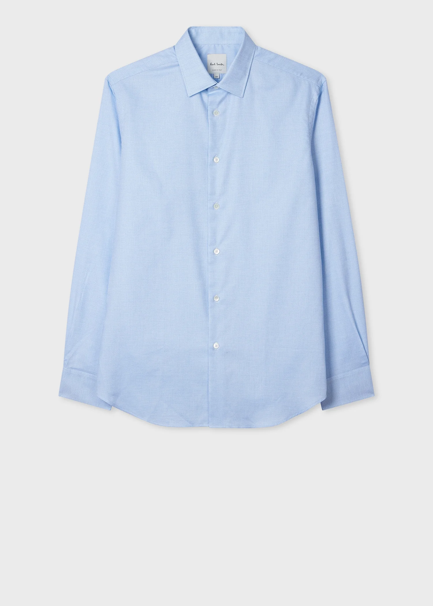 Made in Italy from 100% cotton, this easy iron shirt features a blue micro geo pattern throughout. Cut for a tailored-fit, this timeless shirt is a wardrobe essential for both smart and casual occasions alike. Complete with a contrasting 'Artist Stripe' cuff lining. The Fit - Tailored-Fit is slim through waist and wider through the chest and hem. Product Code: M1R-800P3-P01918-40B